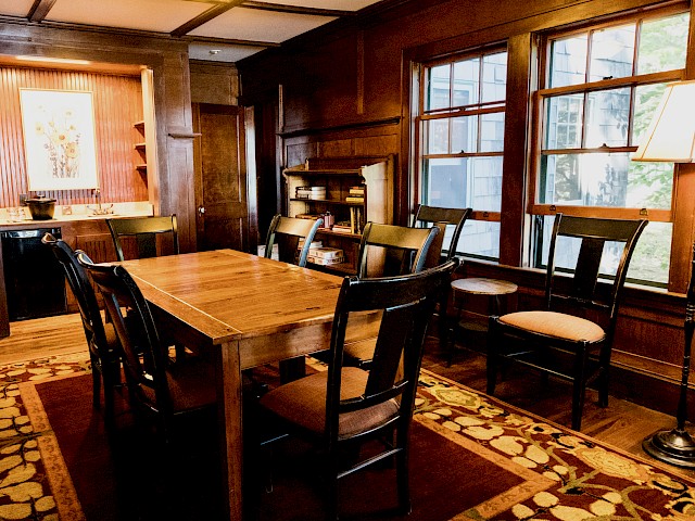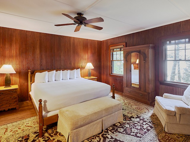 Lake House is a five bedroom, five and a half bath two story classic Maine lakeside cottage. There is a private terrace with lounge chairs as well as a private beach area in front of the cottage. On the first floor is a wraparound screened porch, sun room, large living room with fieldstone fireplace, TV room (with pullout couch and attached ½ bath), and wet bar with undercounter refrigerator. The primary bedroom with king bed and private bath is also on the first floor. The second floor has three bedrooms each with queen bed, plus one bedroom with a king or twin beds; each of these 4 bedrooms has a private bath. There are three steps to enter from the parking area behind the cottage.