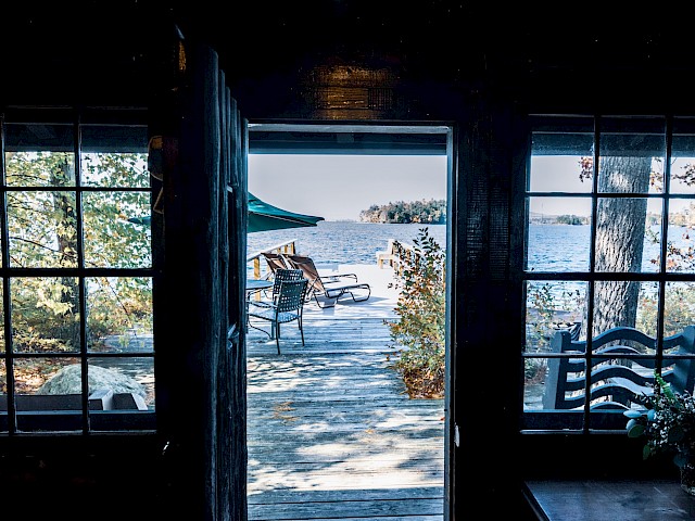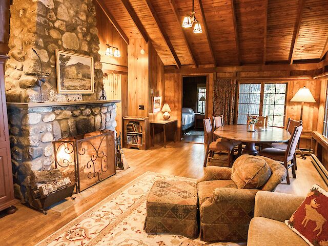 Moose Point is a special secluded lakeside cottage with its own private dock. The cottage has an open front deck, a spacious living room with cathedral ceiling, fieldstone fireplace with a seating area on one side and a large table which is great for family activities. The cottage is equipped with a flat screen TV and a “kitchen” with an undercounter refrigerator and plenty of storage. The primary bedroom has a king bed and the adjacent bathroom has a tub/shower combination. The second bedroom can be set up as king bed or twins and the en-suite bathroom has a combination tub/shower. The third bedroom is located in the second floor “loft” and can be set up as a king bed or twins. The living room has a queensize pullout couch and room for a cot or pack ‘n play. There is adjacent private parking and the walk to the Main Lodge takes around 3 minutes over a wooded path. The Moose Point “guest house” is located about 50 yards from the main house deck, right on the lake. This studio bedroom has large front windows, a queen bed, small sitting area, wet bar with undercounter refrigerator, and ½ bath. Just outside is a tiled shower room. The “guest house” opens up to a private dock furnished with lounge chairs and is great for a swim or for tying up small boats.