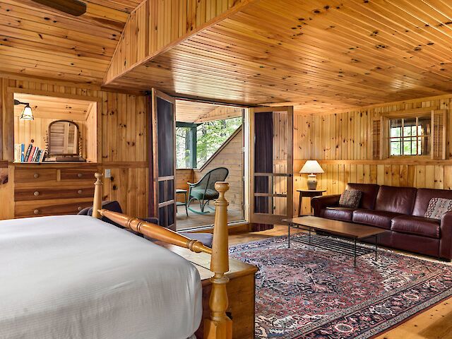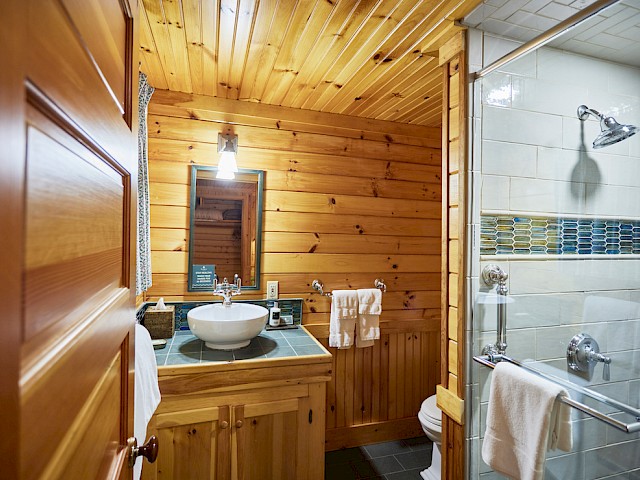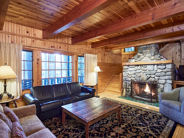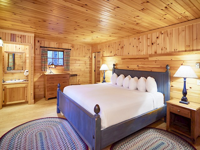 Whippoorwill has a long front porch with rockers and lovely lake views. The living room has a fieldstone fireplace, flat screen TV, and wet bar with undercounter refrigerator. There are two first floor bedrooms, one with king bed and en-suite bathroom with tub/shower combination, and the other has a king bed or twins. The adjacent hall bath has a tub/shower combination. Upstairs, the primary bedroom has a king bed, private covered balcony overlooking the lake and full bath with dual sinks and tub/shower combination. The second upstairs bedroom can be a king bed or twins and has an en-suite bathroom with walk-in shower. There are 10 steps to the front porch.