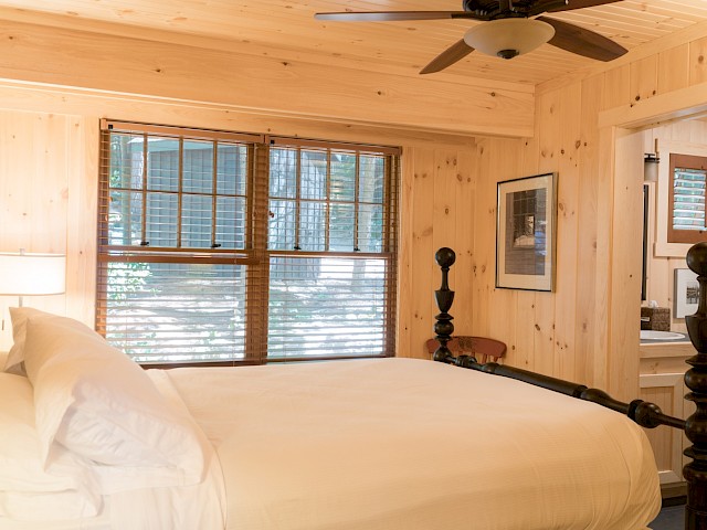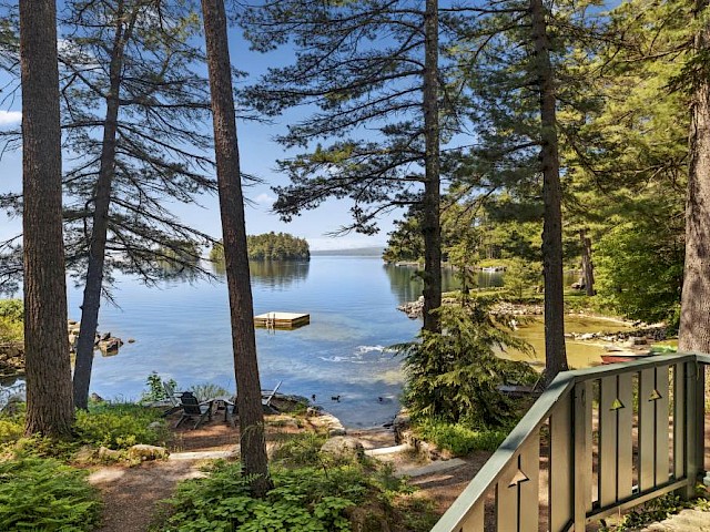 Gray Gull 1 is a three bedroom/three bath lakeside duplex cottage. There are wonderful views of the lake from rockers on the front porch. The living room has a fieldstone fireplace, flat screen TV, and wet bar with undercounter refrigerator. There are two first floor bedrooms. The first has a queen bed with en-suite bathroom with shower, and the second can be set up as a king bed or twin beds, also with en-suite bath with a tub/shower combination. The second floor primary bedroom is a spacious room with king bed, private balcony overlooking the lake and large en-suite bathroom with stall shower and separate soaking tub. There is a pullout couch in the living room and space for a cot or pack n’ play. There are 8 stone steps up to the front porch.