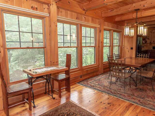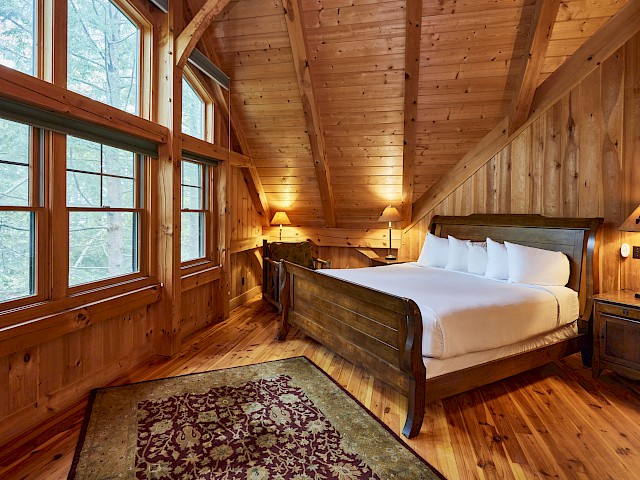 Timbers is a centrally located post and beam cottage with two bedrooms (one with king bed, one with queen) and two full baths (one with shower/tub, one with steam shower) upstairs and a loft space with twin beds. There is also a small first floor single bed alcove with a half bath adjacent to the nearby living room. There is a large furnished open deck, living room with massive fieldstone fireplace, a dining table (great for family games, crafts and puzzles) and a full kitchen. All meals are included in your rate, so the full size refrigerator is convenient for drinks and snacks.