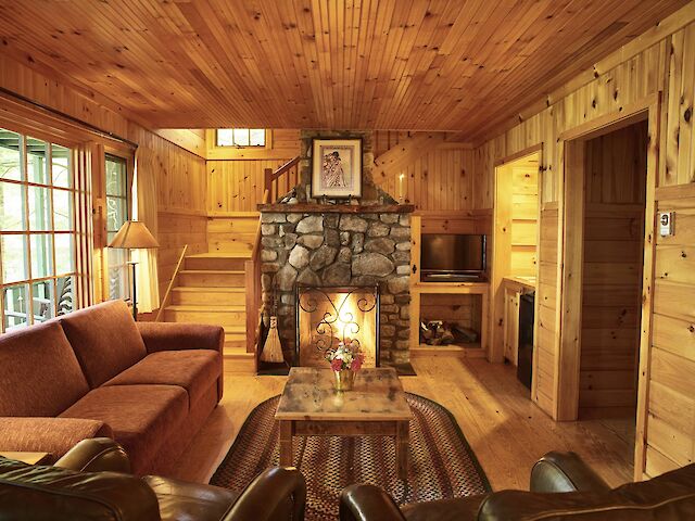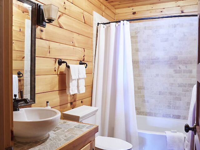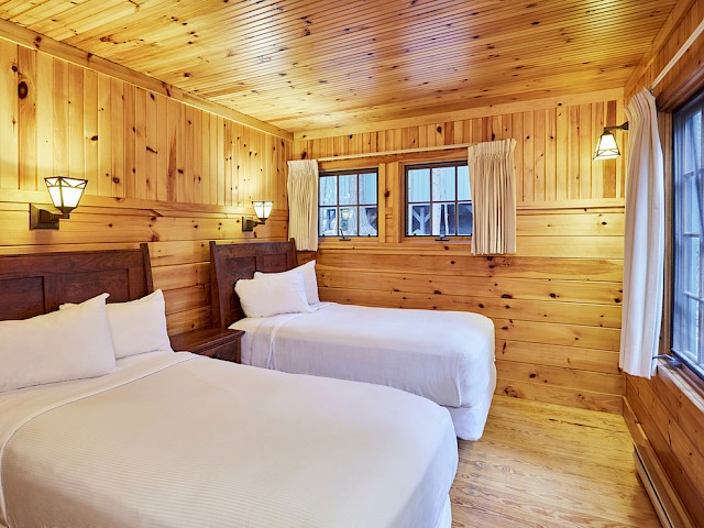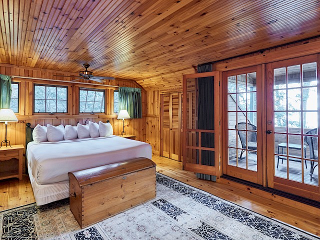 White Pine has a covered front porch with rockers and lake views. The living room has a fieldstone fireplace, wet bar with undercounter refrigerator, and a flat screen TV. There are two first floor bedrooms. The first has a queen bed and the second can be made up as a king or twins. These bedrooms share a full bath in the hallway which has a tub/shower combination. The primary bedroom on the second floor has a king bed, furnished covered balcony overlooking the lake, and an en-suite full bath with combination tub/shower. There is a pullout couch in the living room and room for a cot or pack ‘n play. There are 12 steps to the front porch.