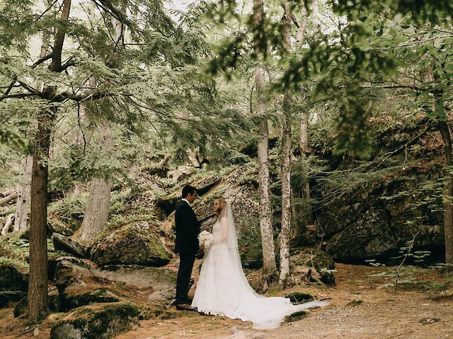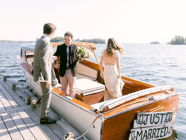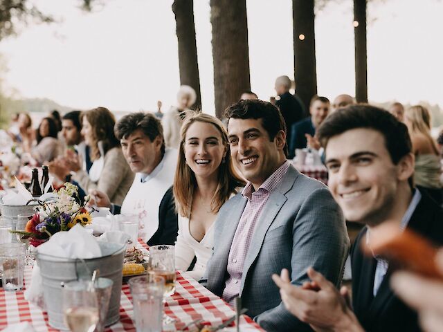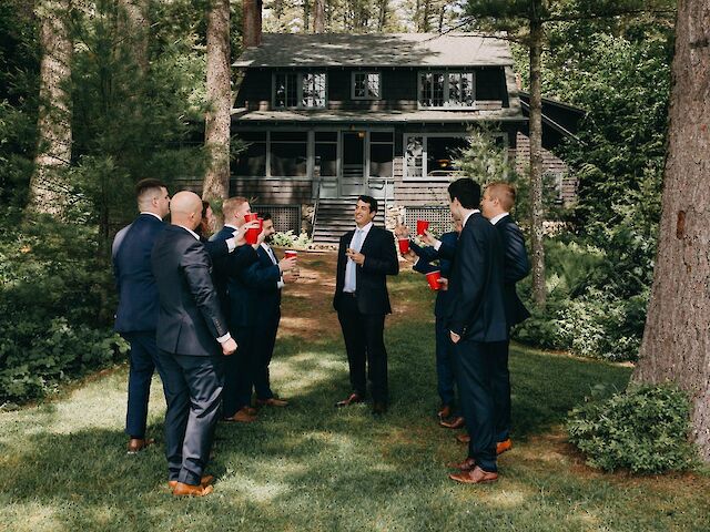 Migis Lodge is a magical location for a wedding and reception... imagine the wedding party arriving at their ceremony on our classic 1947 Chris Craft, and exchanging vows under the pines with Sebago Lake and Maine's Western Mountains serving as a stunning backdrop. After the ceremony, the couple and guests will enjoy cocktails, dinner and dancing in our lakeside lodge, and perhaps finish the evening around a bonfire on our front terrace.