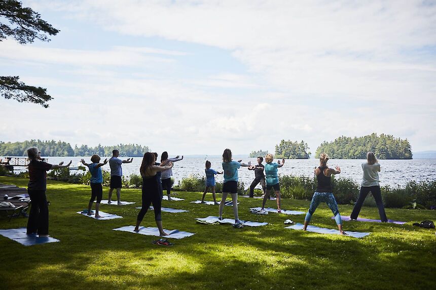 Let the air and scenery of the great outdoors at Migis help rejuvenate your soul. Our body and movement classes take place by the lake at Petunia Terrace, offering an exhilarating chance to re-energize while soaking in the views of distant mountains across Sebago Lake. You can also make the most of your workout at our outdoor Fitness Center. Adjacent to the tennis courts, it features a complete range of cardio machines, weights, and other equipment allowing you to strengthen, stretch and tone while being refreshed by lake breezes and soothing views of woods and water. In June, July and August join our personal trainers for weekday fitness consultations and boot camp classes.