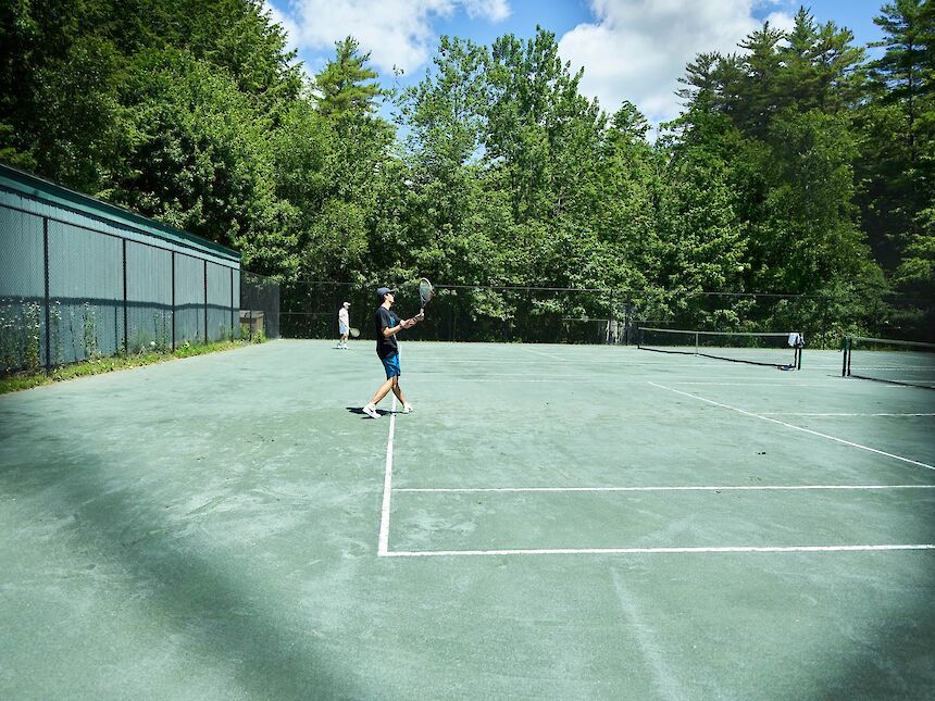 Migis has three lakeside Har-Tru tennis courts to enjoy. Fast and competitive or relaxed and leisurely, enjoy the fresh Maine air and great views either under the sun on our twin courts or nestled among the shady pines of our single court. No need to reserve a court time, and rackets are available to borrow. Private lessons and junior lessons can also be arranged with our local pro, Bob Brusa. Bob has 40+ years of experience in playing, teaching and coaching.