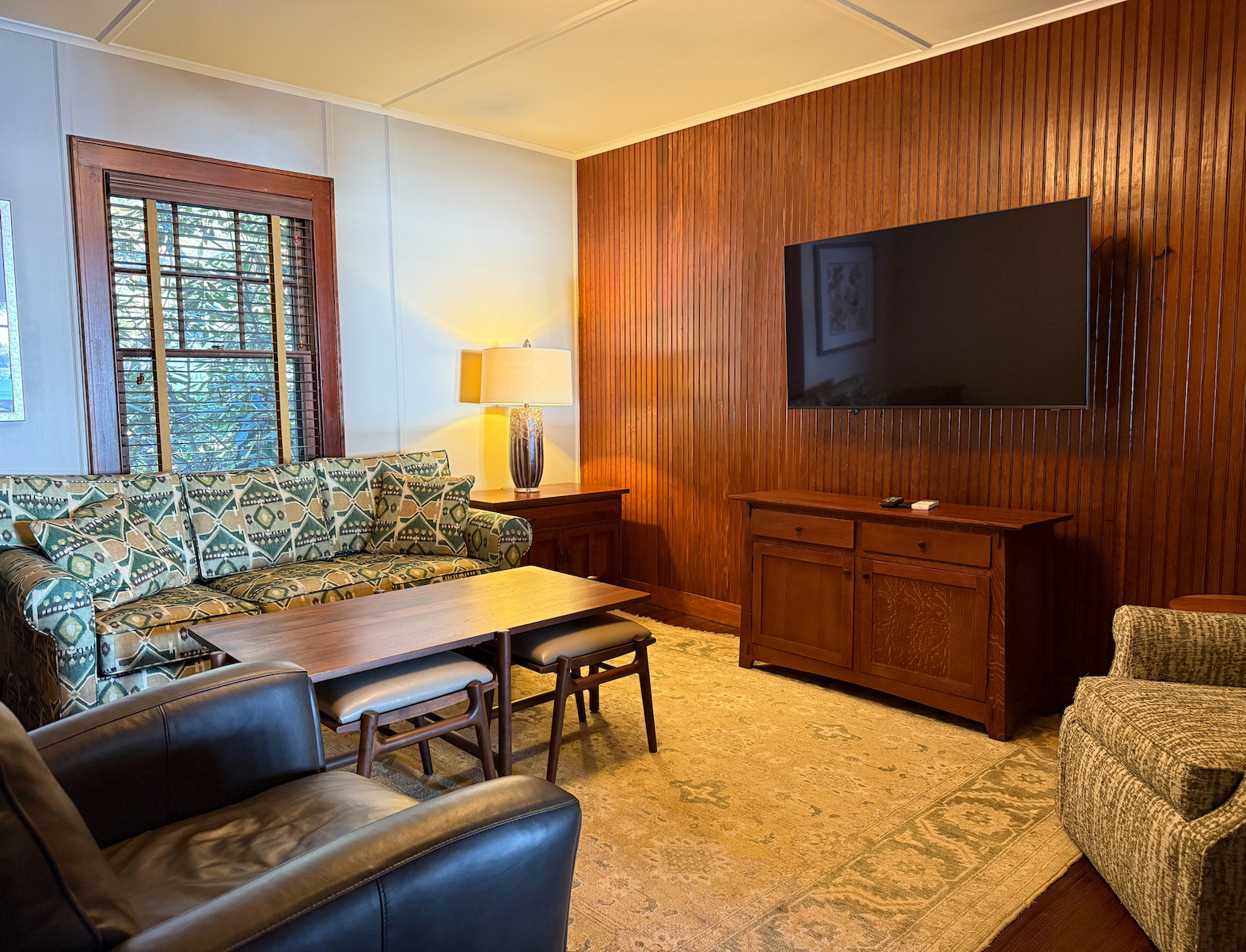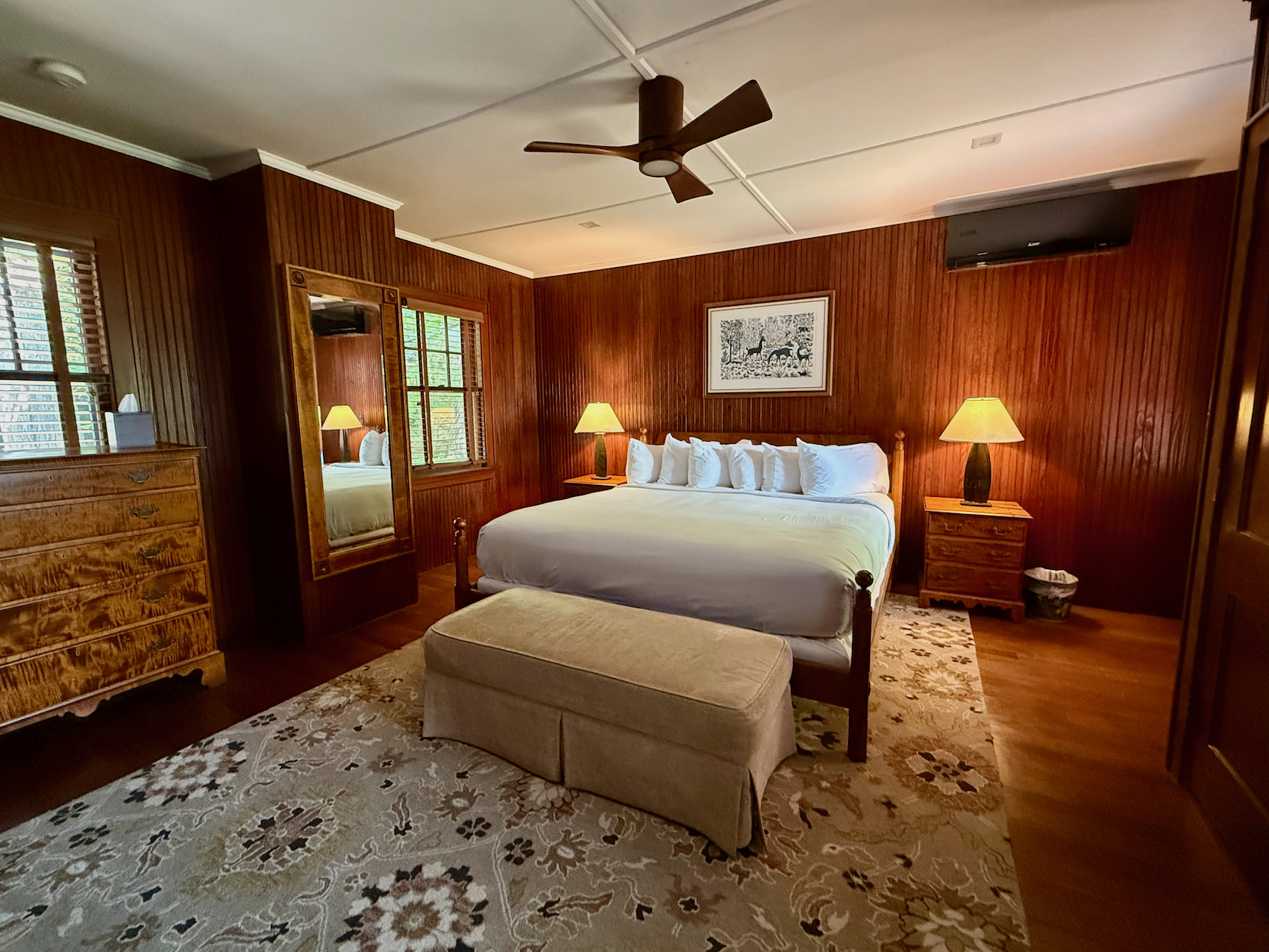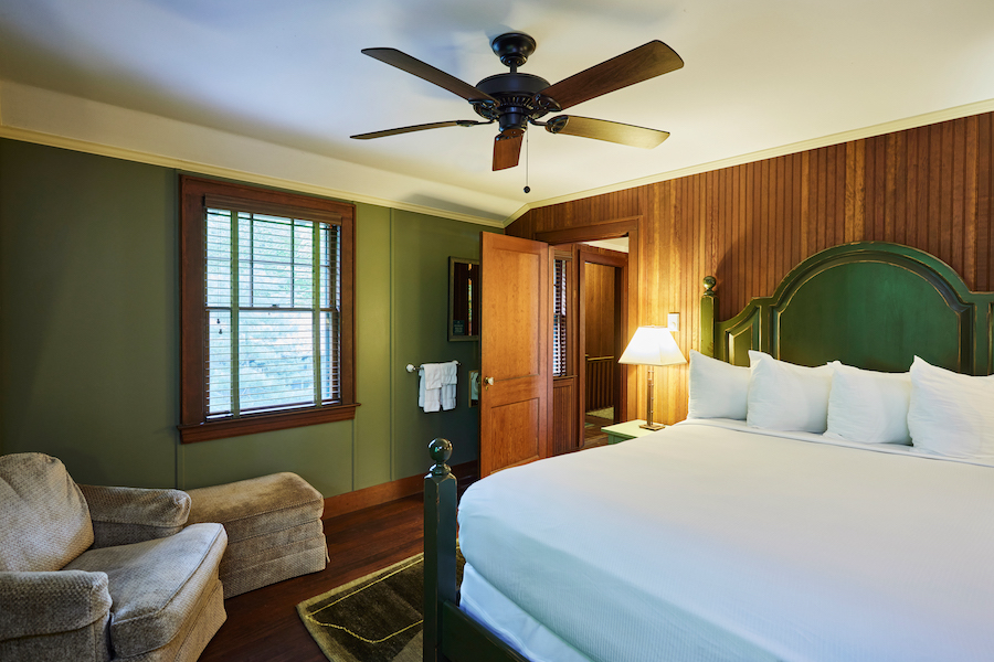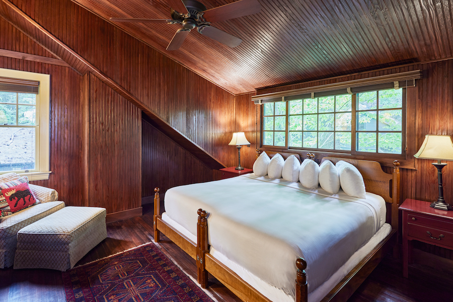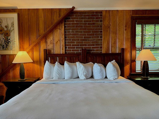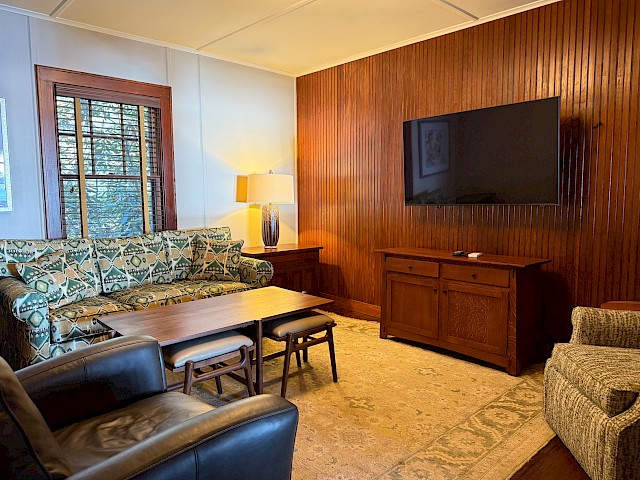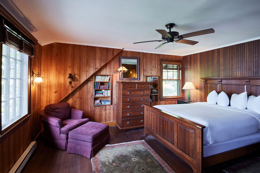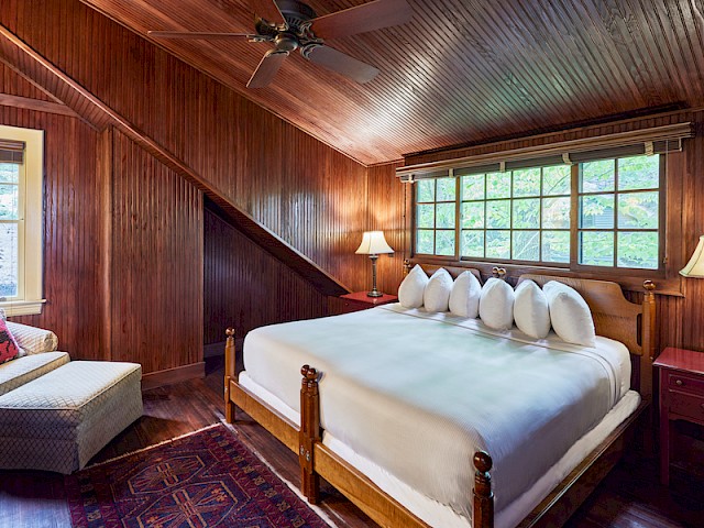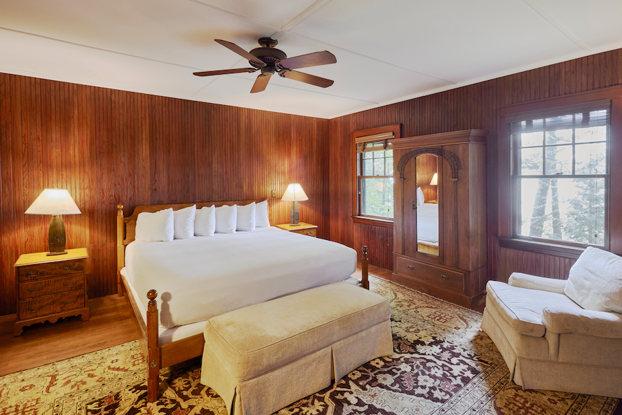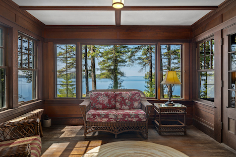 Lake House is a five bedroom, five and a half bath two story classic Maine lakeside cottage. There is a private terrace with lounge chairs as well as a private beach area in front of the cottage. On the first floor is a wraparound screened porch, sun room, large living room with fieldstone fireplace, TV room (with pullout couch and attached ½ bath), and wet bar with undercounter refrigerator. The primary bedroom with king bed and private bath is also on the first floor. The second floor has three bedrooms each with queen bed, plus one bedroom with a king or twin beds; each of these 4 bedrooms has a private bath. There are three steps to enter from the parking area behind the cottage.