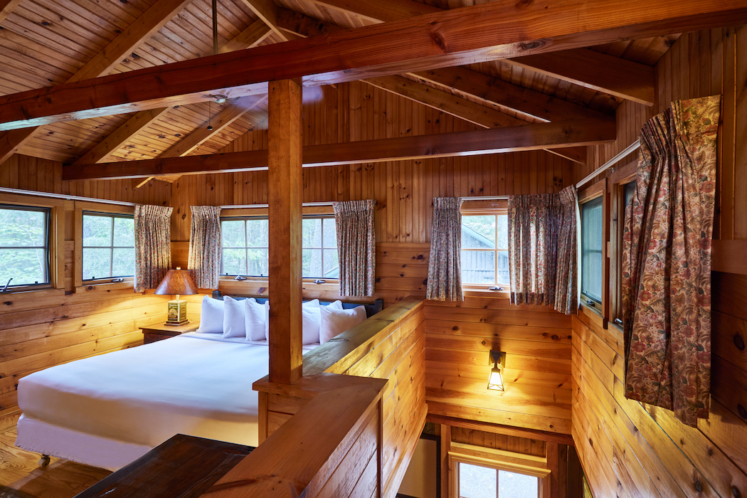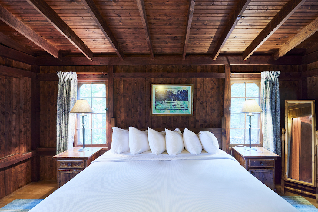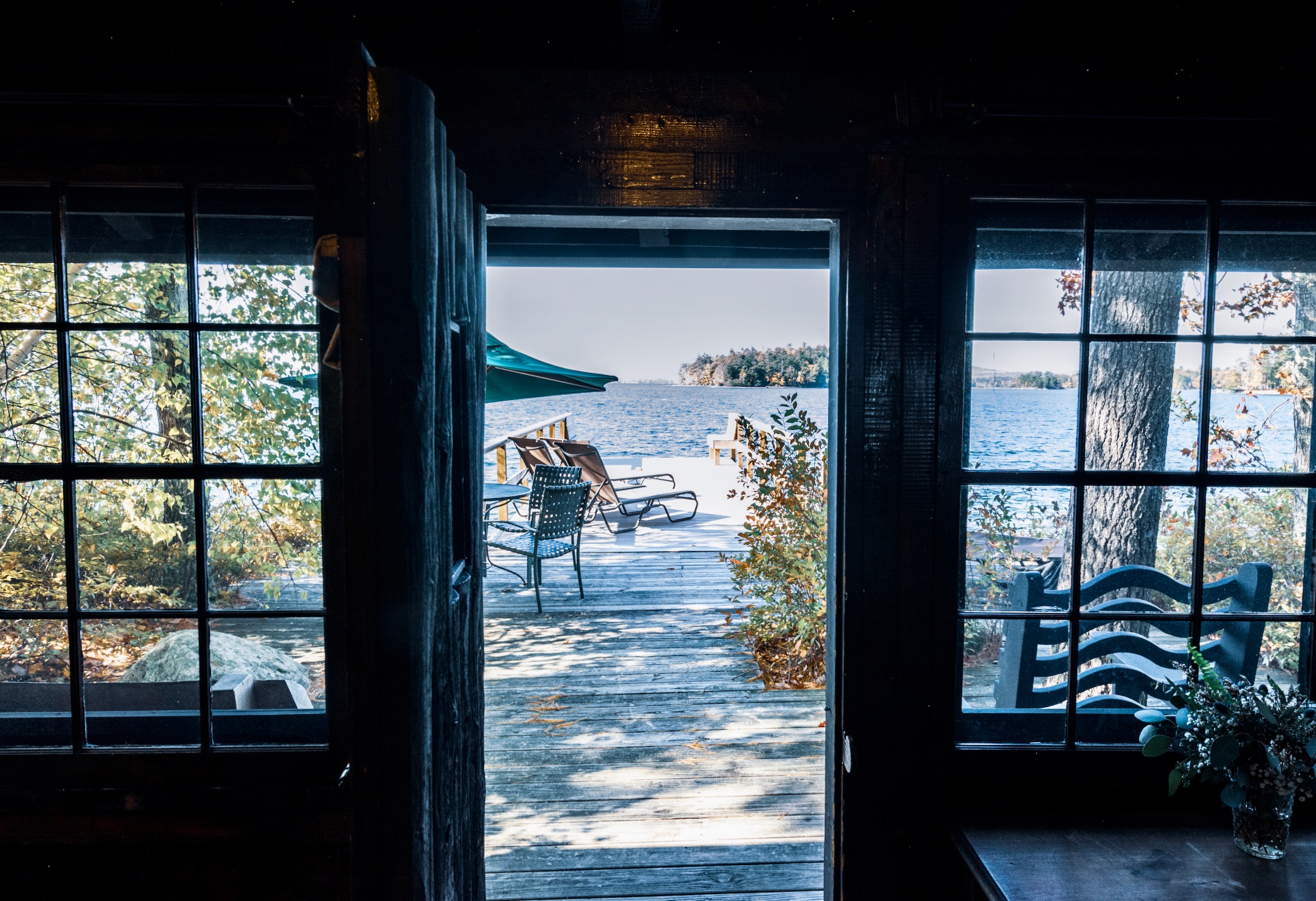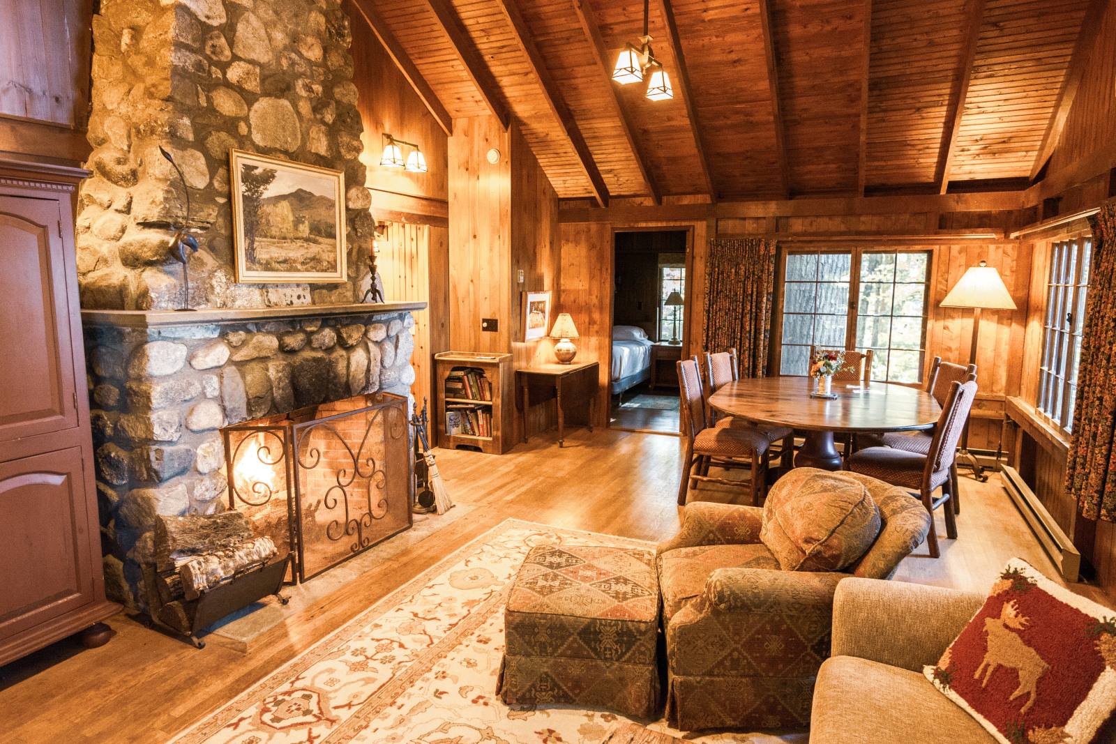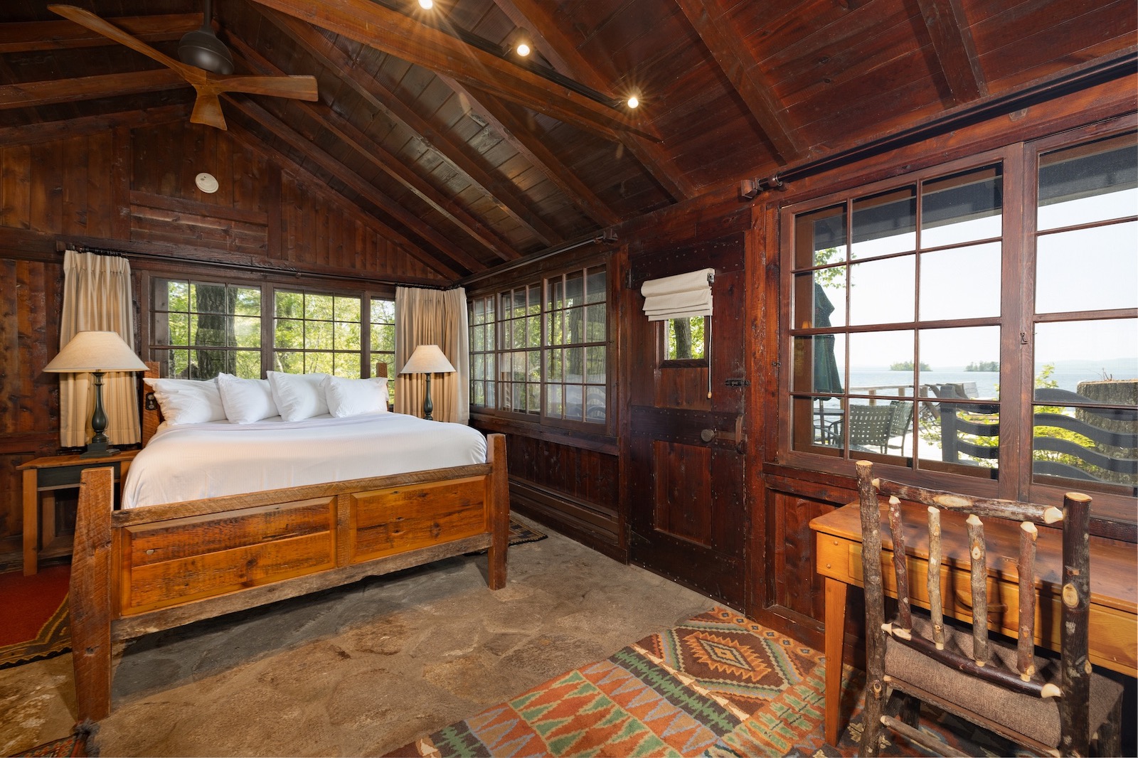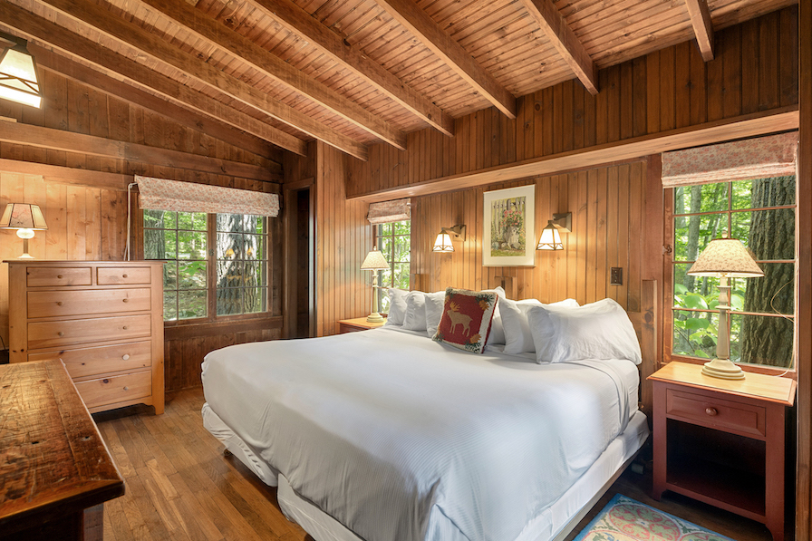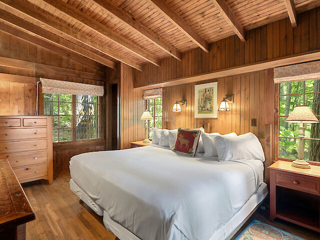 Moose Point is a special secluded lakeside cottage with its own private dock. The cottage has an open front deck, a spacious living room with cathedral ceiling, fieldstone fireplace with a seating area on one side and a large table which is great for family activities. The cottage is equipped with a flat screen TV and a “kitchen” with an undercounter refrigerator and plenty of storage. The primary bedroom has a king bed and the adjacent bathroom has a tub/shower combination. The second bedroom can be set up as king bed or twins and the en-suite bathroom has a combination tub/shower. The third bedroom is located in the second floor “loft” and can be set up as a king bed or twins. The living room has a queensize pullout couch and room for a cot or pack ‘n play. There is adjacent private parking and the walk to the Main Lodge takes around 3 minutes over a wooded path. The Moose Point “guest house” is located about 50 yards from the main house deck, right on the lake. This studio bedroom has large front windows, a queen bed, small sitting area, wet bar with undercounter refrigerator, and ½ bath. Just outside is a tiled shower room. The “guest house” opens up to a private dock furnished with lounge chairs and is great for a swim or for tying up small boats.