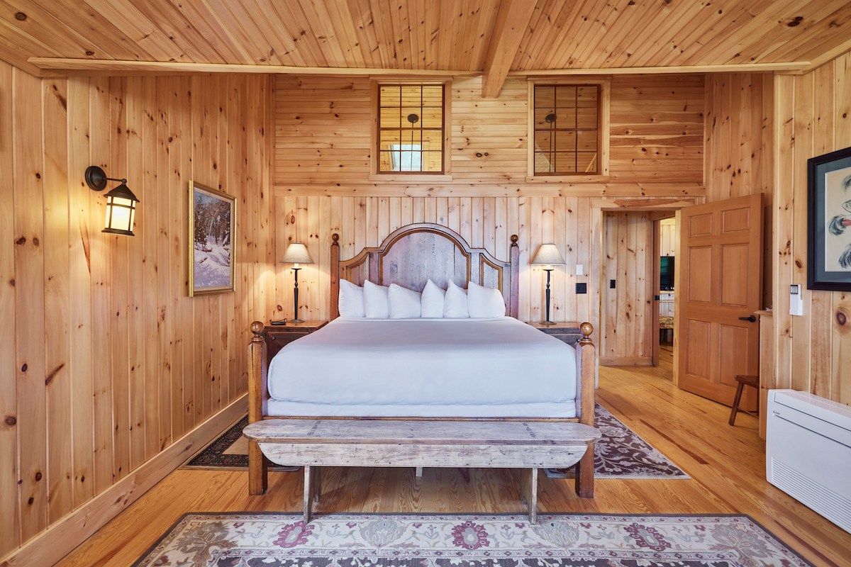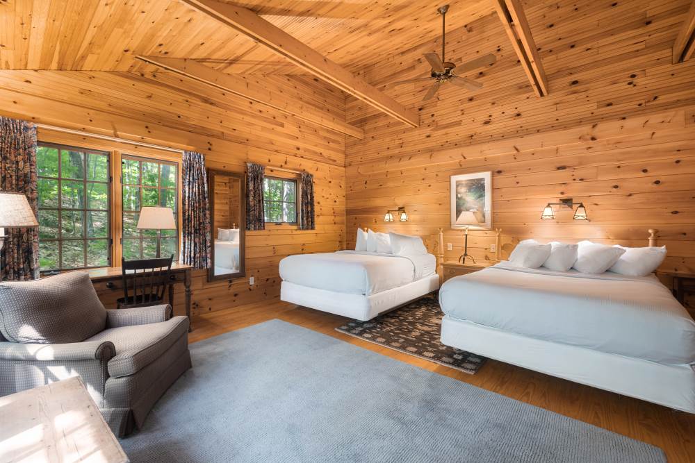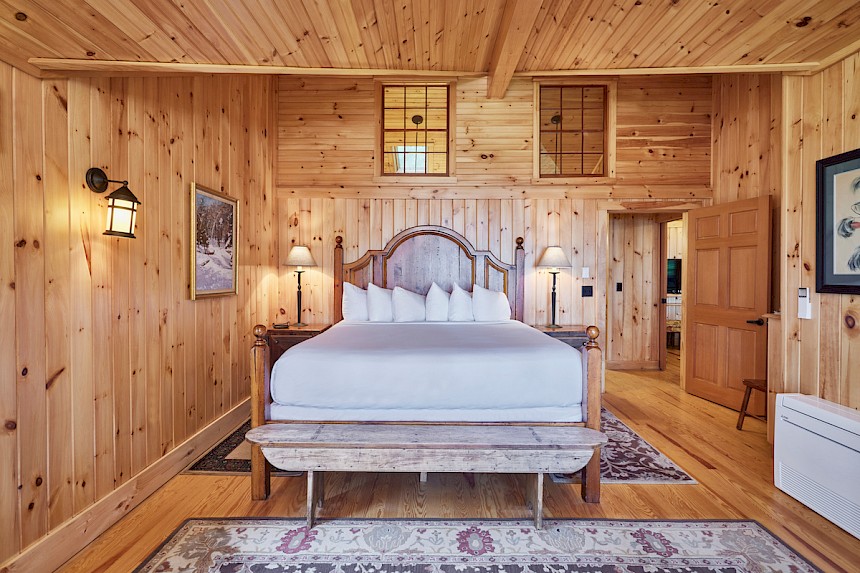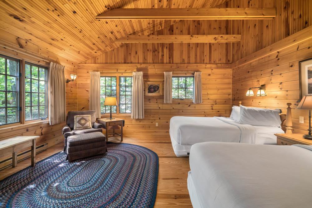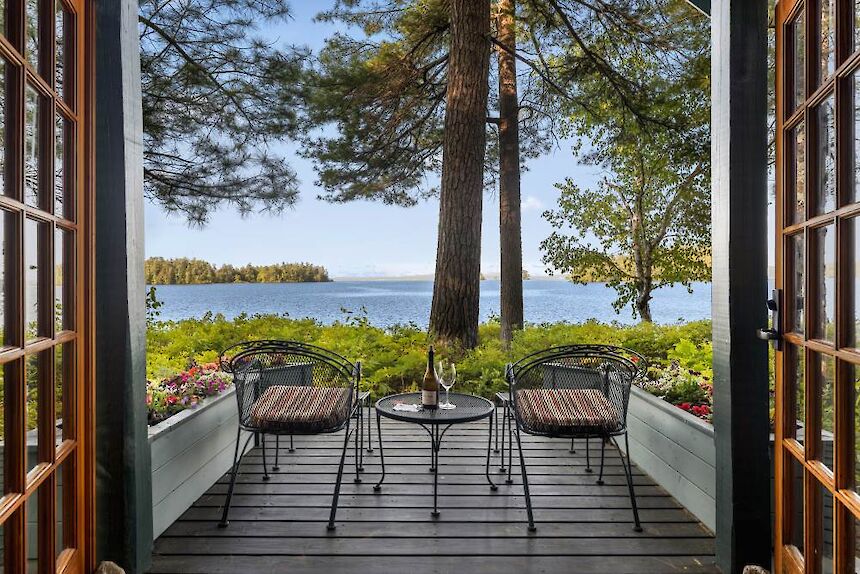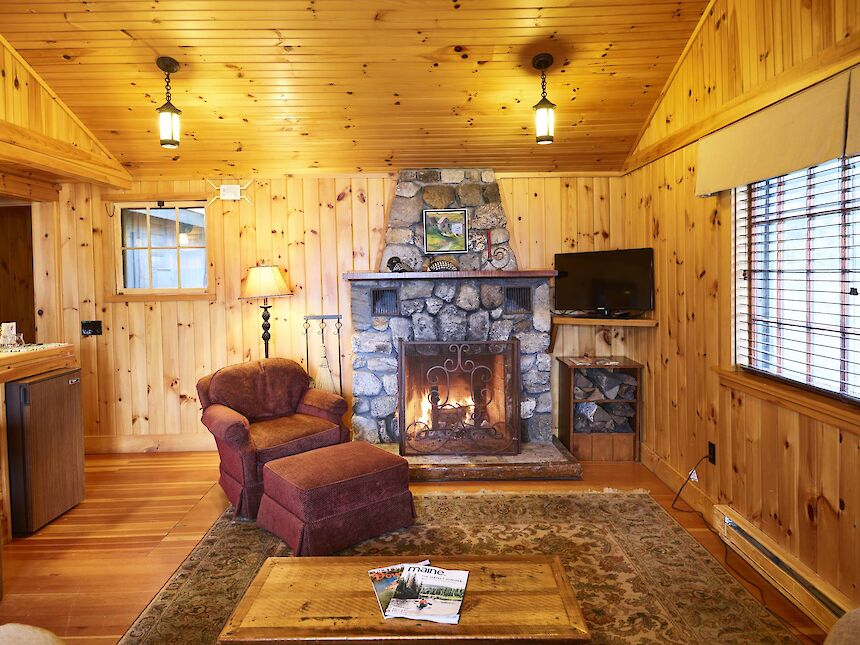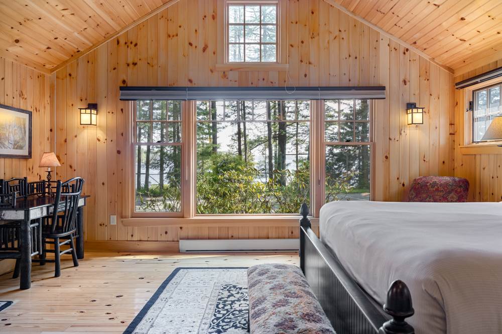 North Star is conveniently located adjacent to the Main Lodge and has a covered front porch with rockers and a great view of Sebago Lake. It has a cozy living room with pull out couch and fieldstone fireplace, and a separate bedroom with king bed and lake view.
