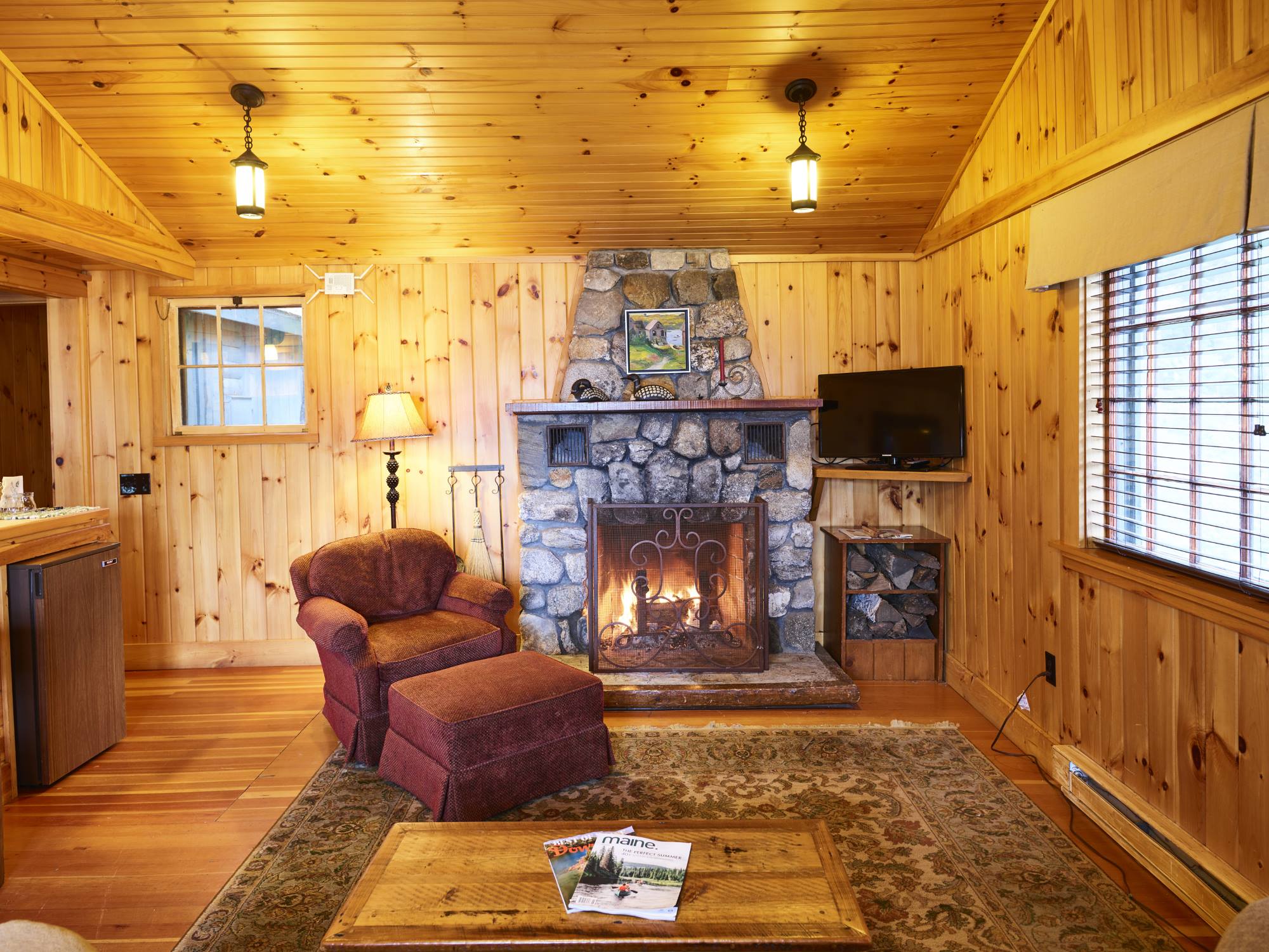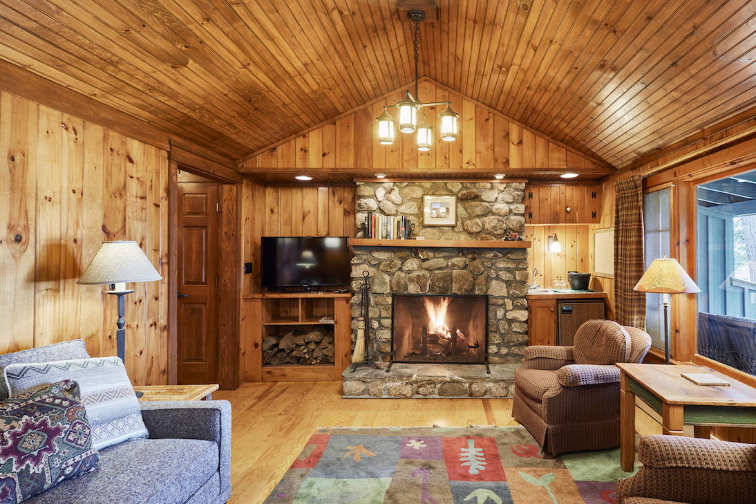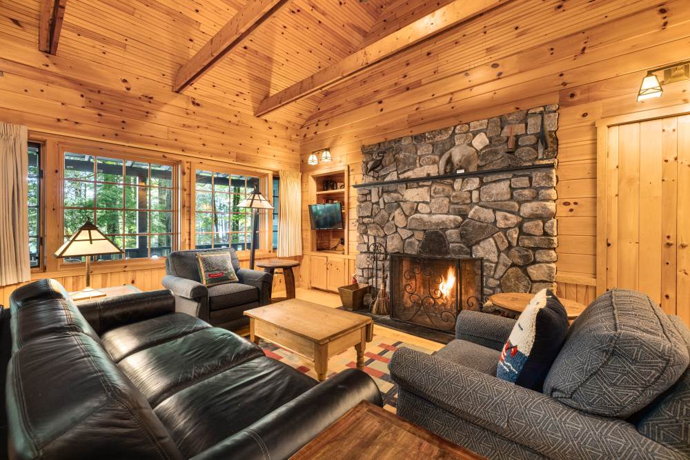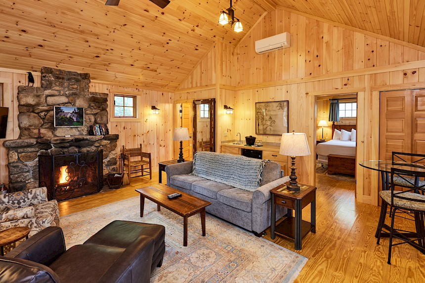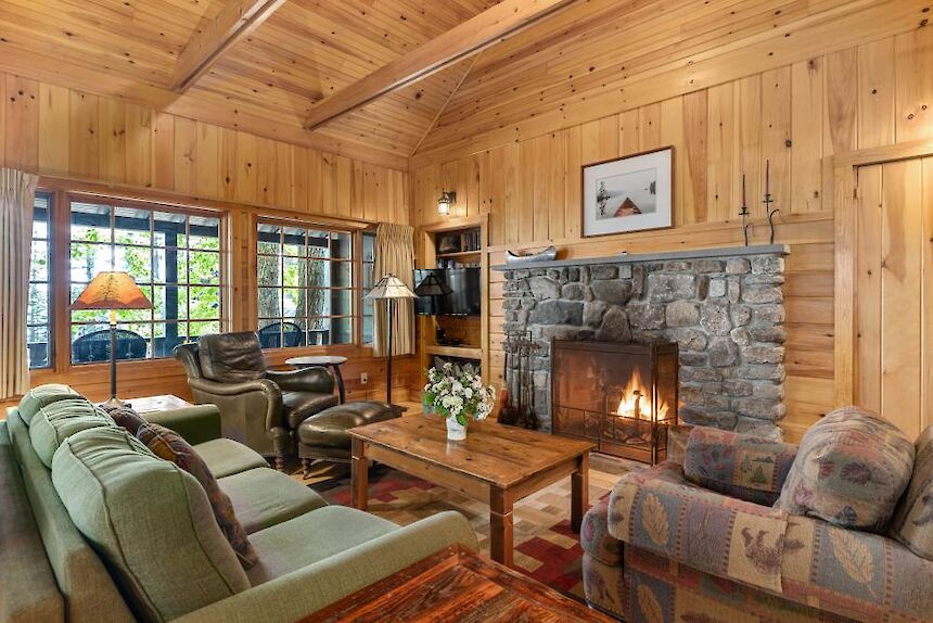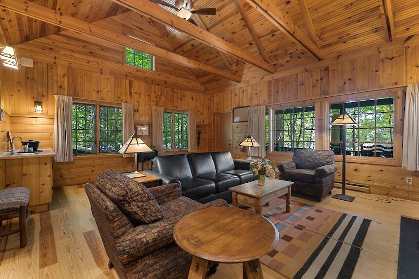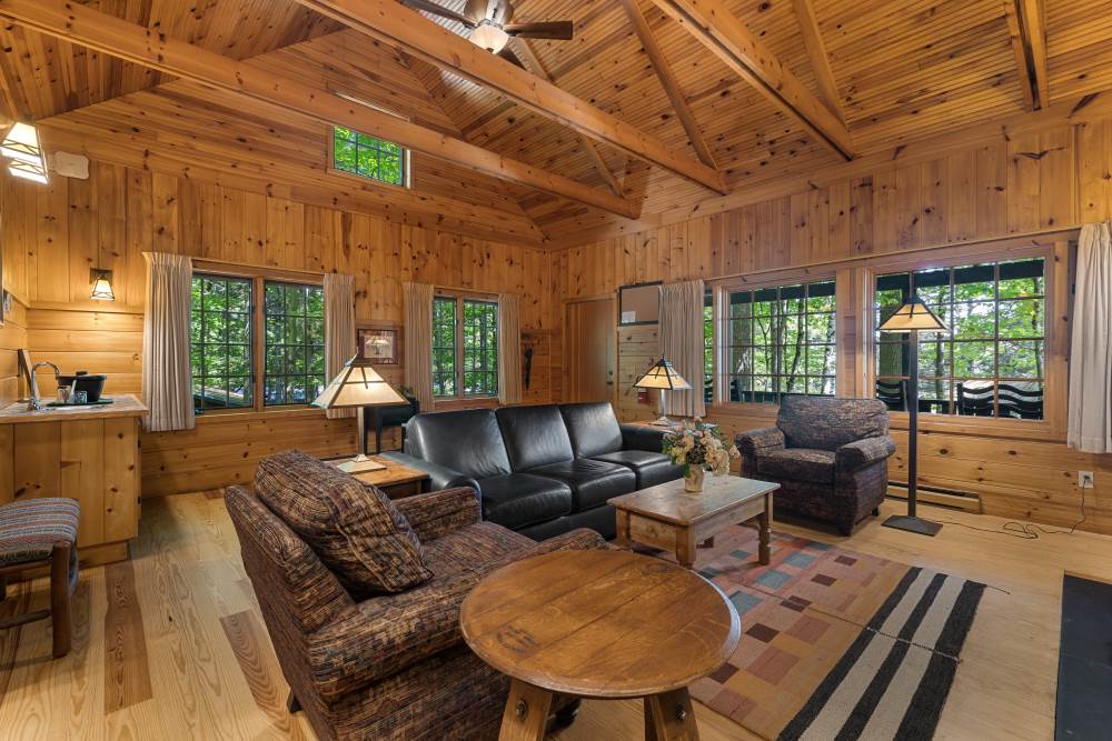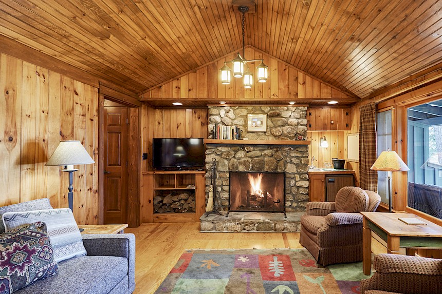 Canoe is one of 6 identical cottages, and is one of our largest one bedroom cottages. The furnished front porch has lake views and the living room has cathedral ceiling, fieldstone fireplace, flat screen smart TV, and wet bar with undercounter refrigerator.
