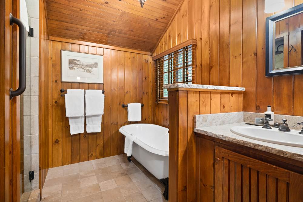 Cobblestone has a front porch with comfortable wicker furnishings and views of the lake through the pines. There is a living room with cathedral ceiling, fieldstone fireplace, flat screen smart TV, wet bar with under-counter refrigerator, separate bedroom with king bed, and spacious bathroom with claw foot soaking tub and oversized separate shower.