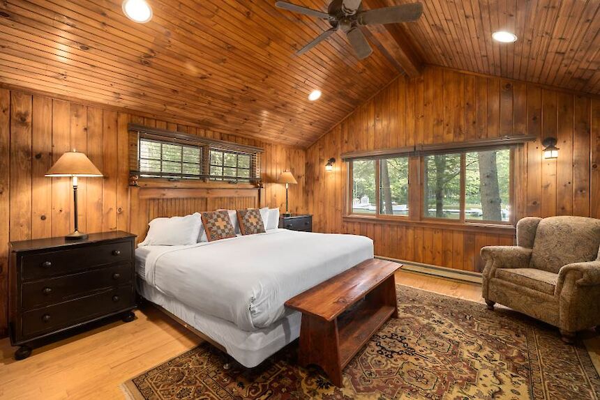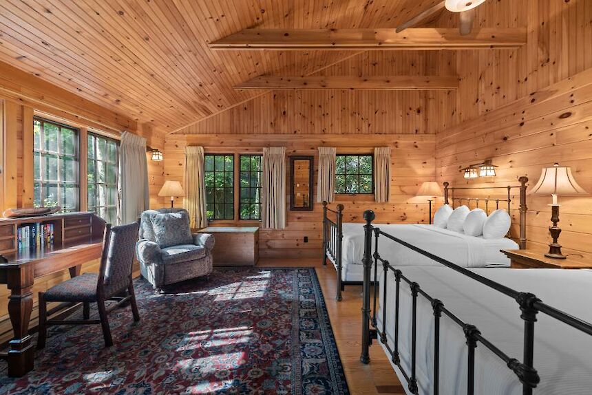 Cedar has a covered front porch furnished with comfortable wicker chairs and views of the lake across our shaded tennis court. The living room has cathedral ceilings, a fieldstone fireplace, and separate wet bar area. Oversized bedroom with king bed, lake views and a spacious bathroom with clawfoot tub and separate shower.