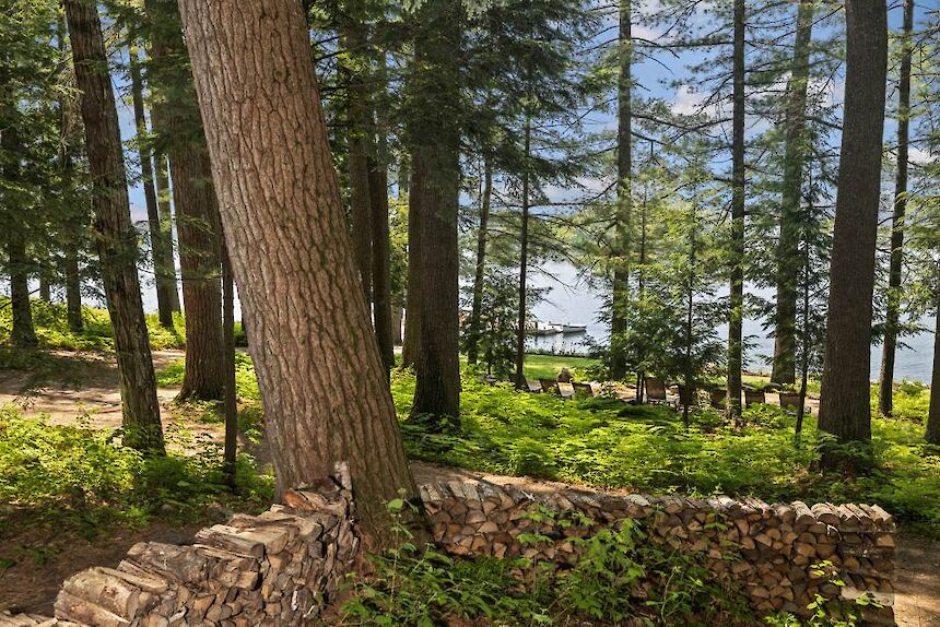 Stone's Throw has a premier location just a “Stone’s Throw” from the lake. The cottage has a cobblestone patio, and the double-sided living room has a fieldstone fireplace at one end and French doors leading to a open deck with comfortable chairs facing the lake and sunset terrace.