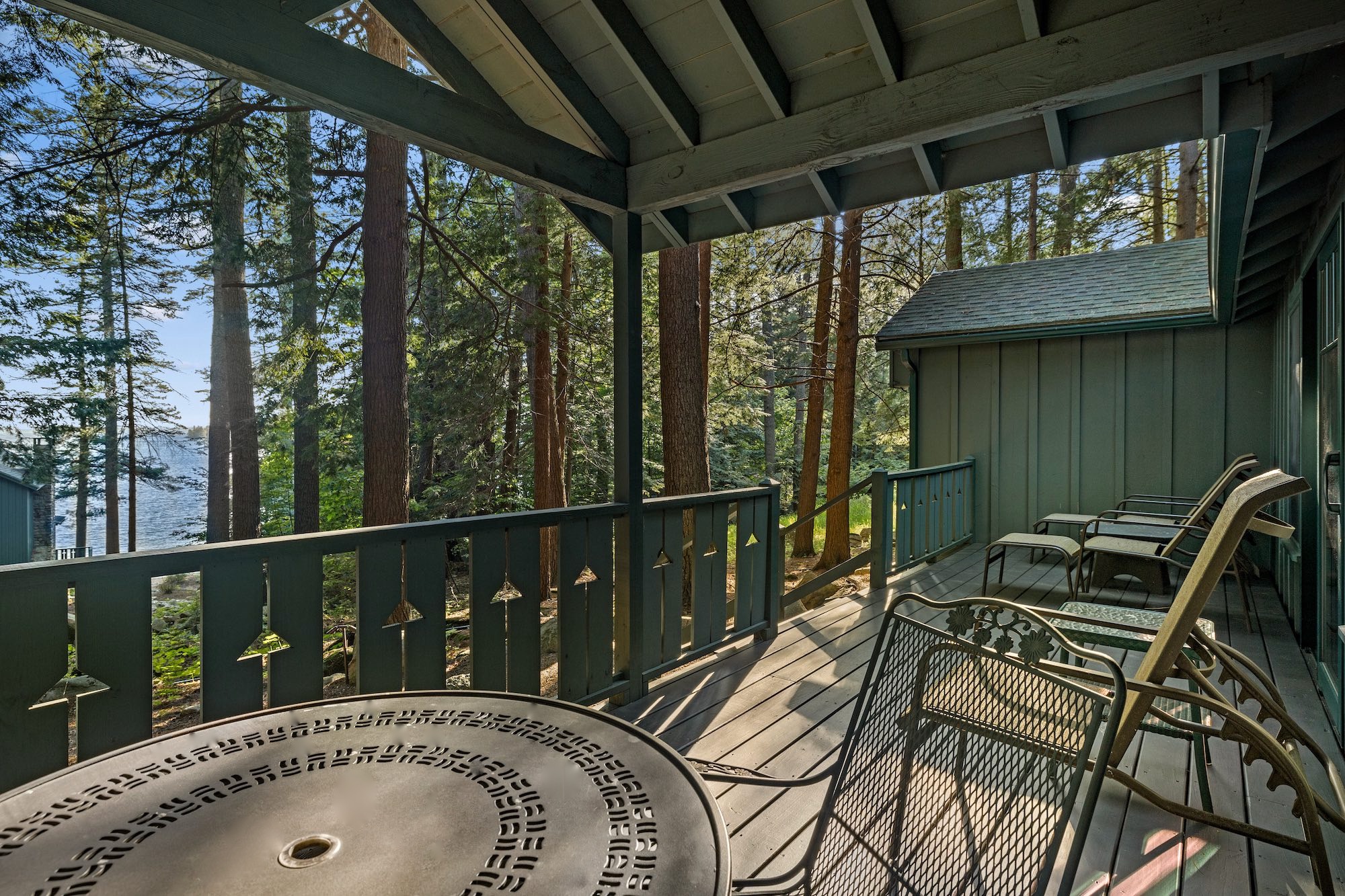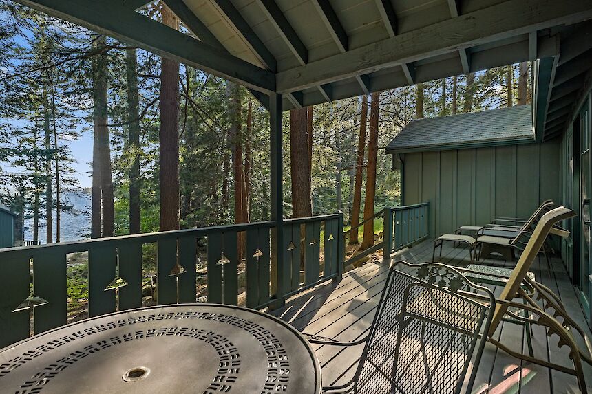 Raven has a roomy covered porch with rockers and lakeview over the very end of our single tennis court and is conveniently located near the Main Lodge. The living room has a cathedral ceiling, fieldstone fireplace, flat screen smart TV, wet bar area with refrigerator.