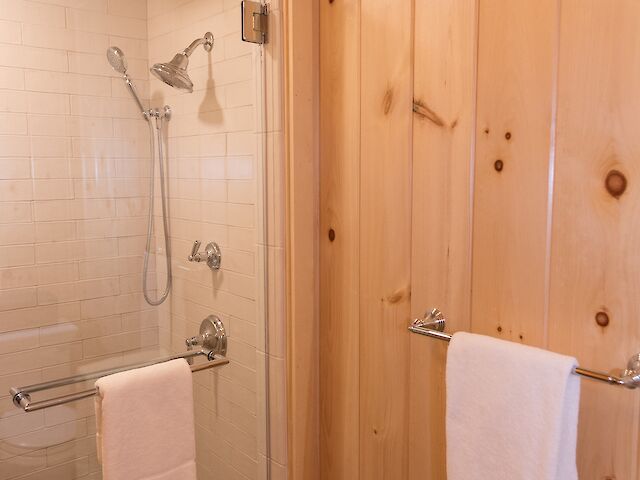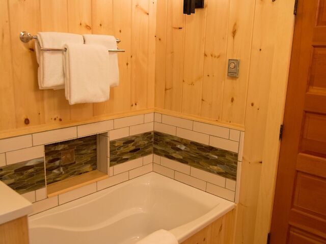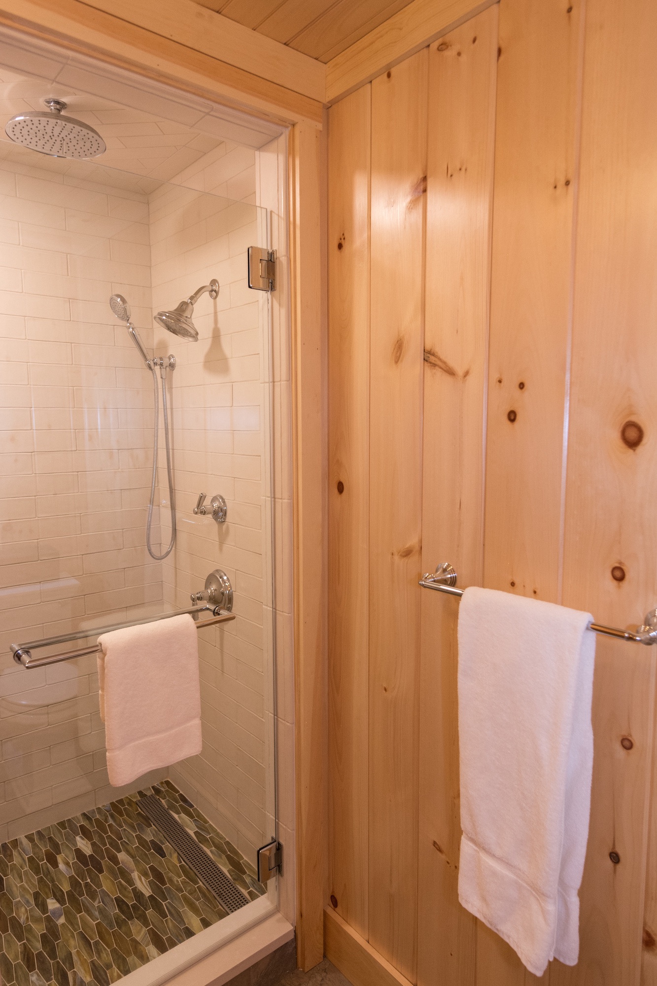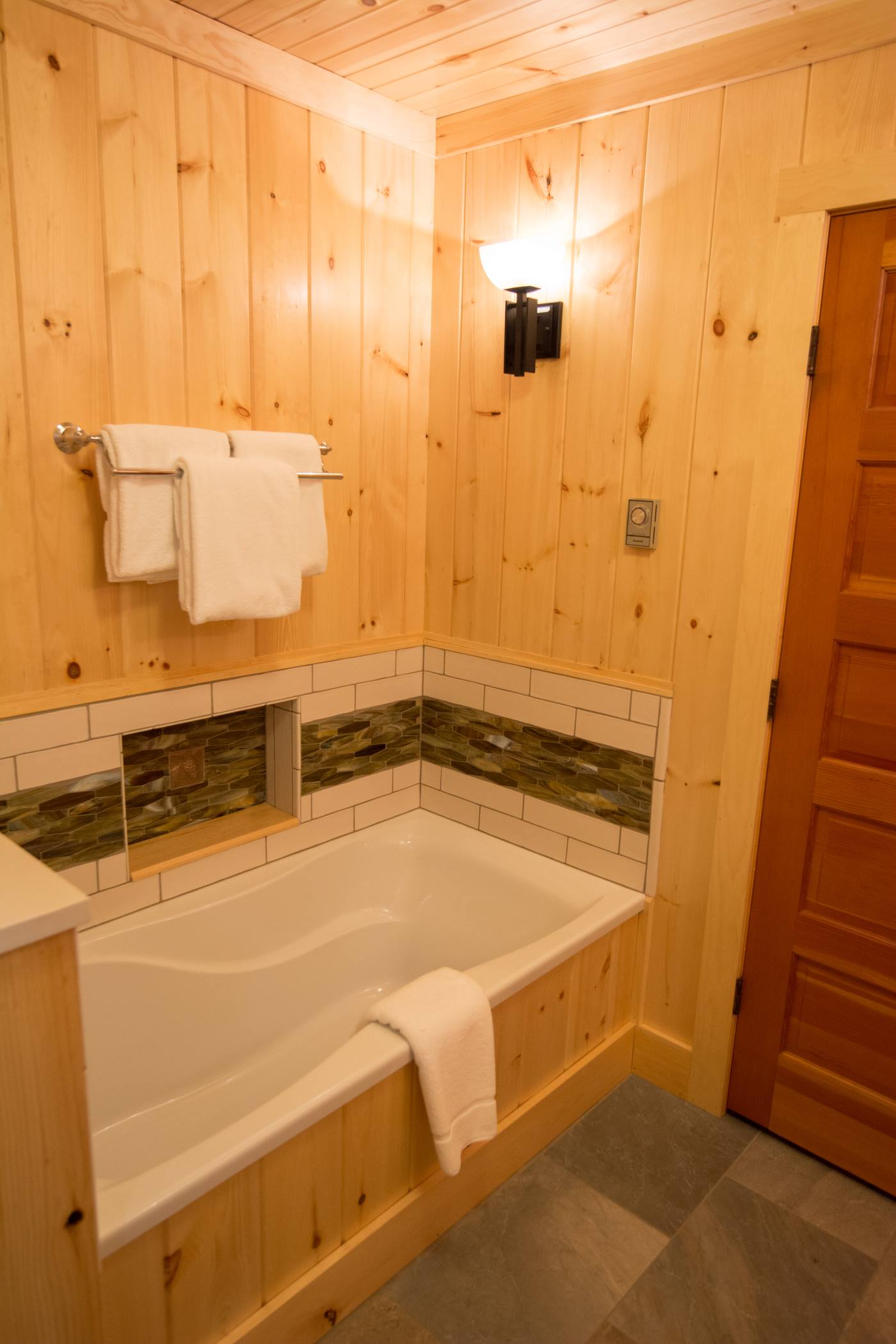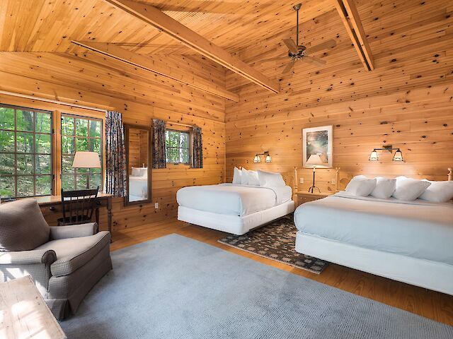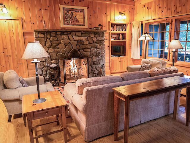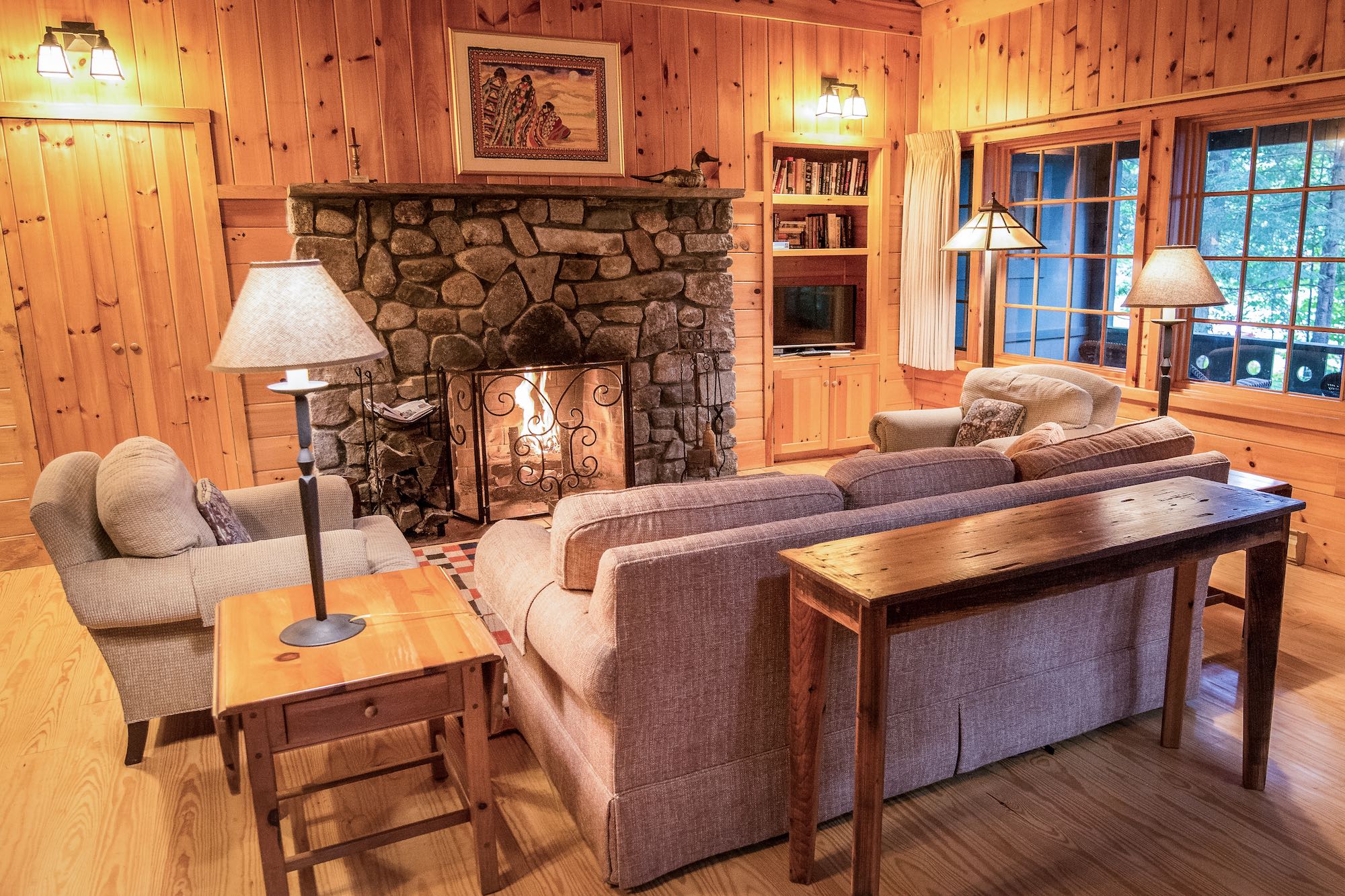 Bittersweet is one of our largest one bedroom duplex cottages. The furnished front porch has lake views and the living room has cathedral ceiling, fieldstone fireplace, flat screen TV, and wet bar with undercounter refrigerator. Up a few steps is a large walk-in closet, a full bath with soaking tub, separate shower, and a convenient vanity just outside. Then, the spacious bedroom with two queen beds. There is a queen-size pullout couch in the living room and room for cot/pack ‘n play. There are 7 steps up to the front porch.