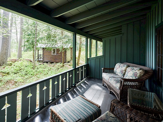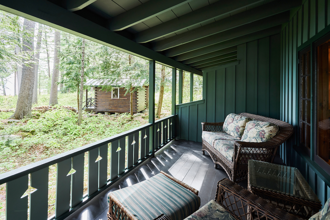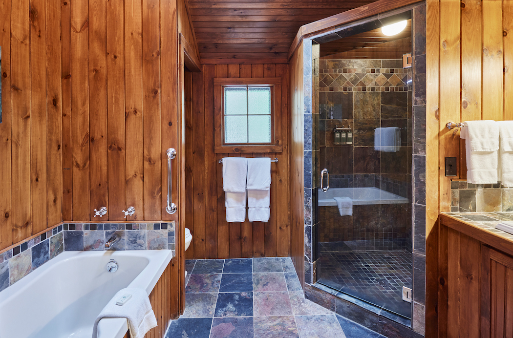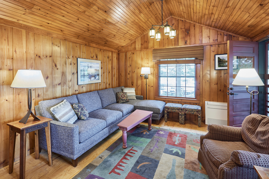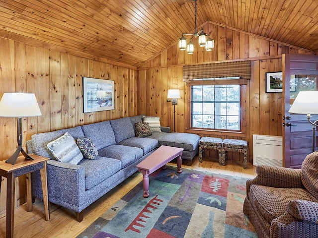 Cove 1 has a front porch with comfortable wicker furnishings and is conveniently located near the boat basin and Cookout Point. The living room has a cathedral ceiling, fieldstone fireplace, flat screen TV, and wet bar with undercounter refrigerator. A dressing area with vanity sits outside the separate bedroom which has a king bed and lake views. The full bath has a soaking tub and separate shower. There is a queen-size pullout couch in the living room and room for cot or pack ‘n play.