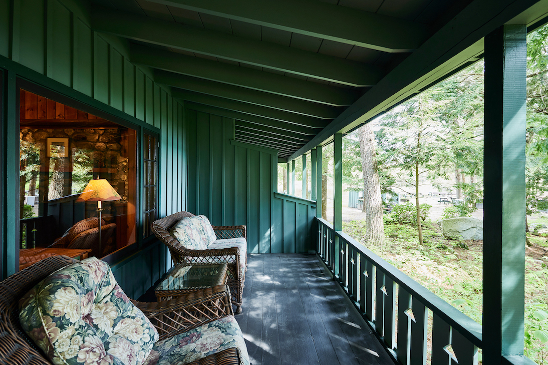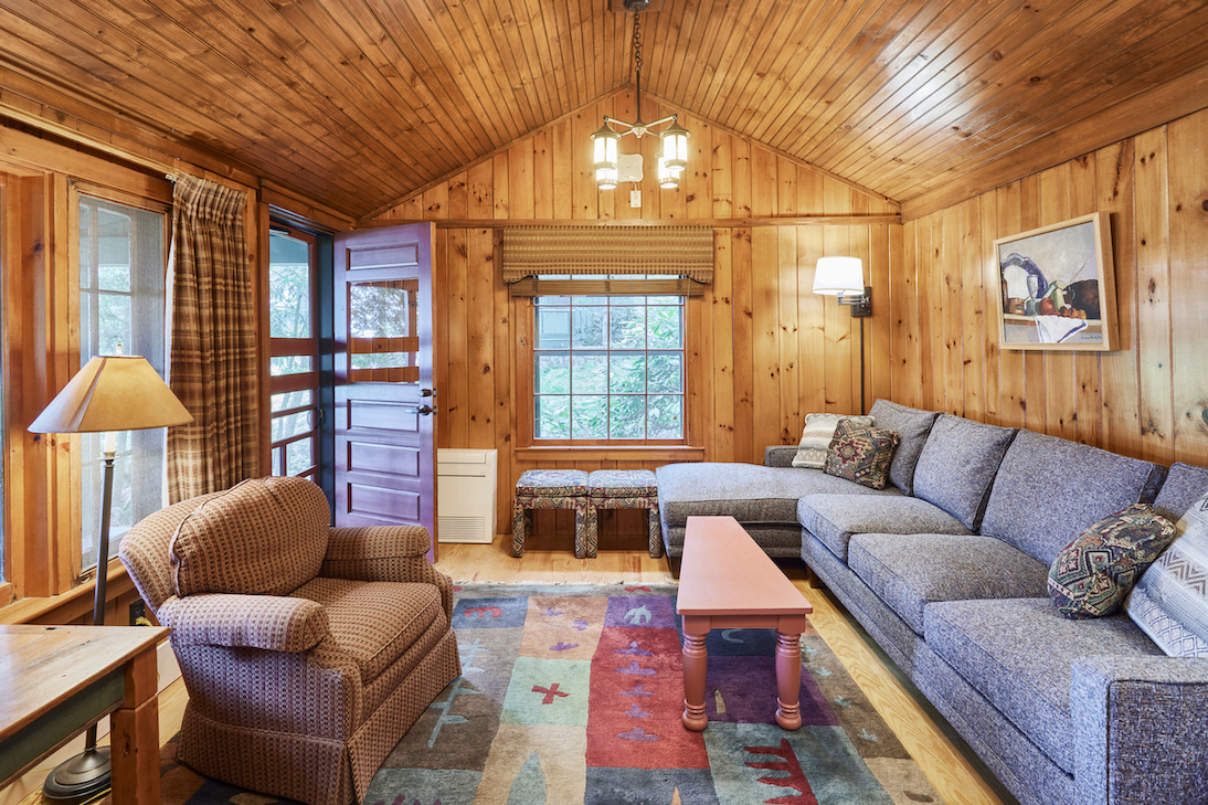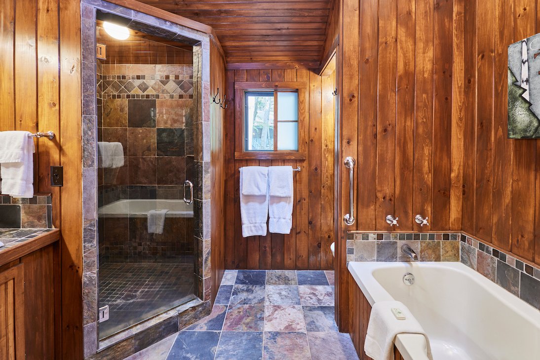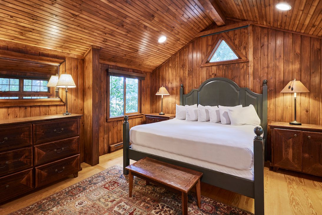 Cove 2 has a front porch with comfortable wicker furnishings and is conveniently located near the boat basin and Cookout Point. The living room has a cathedral ceiling, fieldstone fireplace, flat screen TV, and wet bar with undercounter refrigerator. A dressing area with vanity sits outside the separate bedroom which has a king bed and lake views. The full bath has a soaking tub and separate shower. There is a queen sized pullout couch in the living room and room for cot or pack ‘n play.