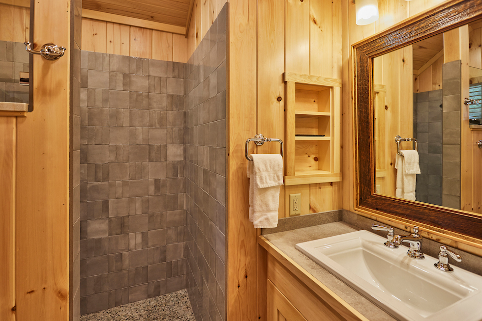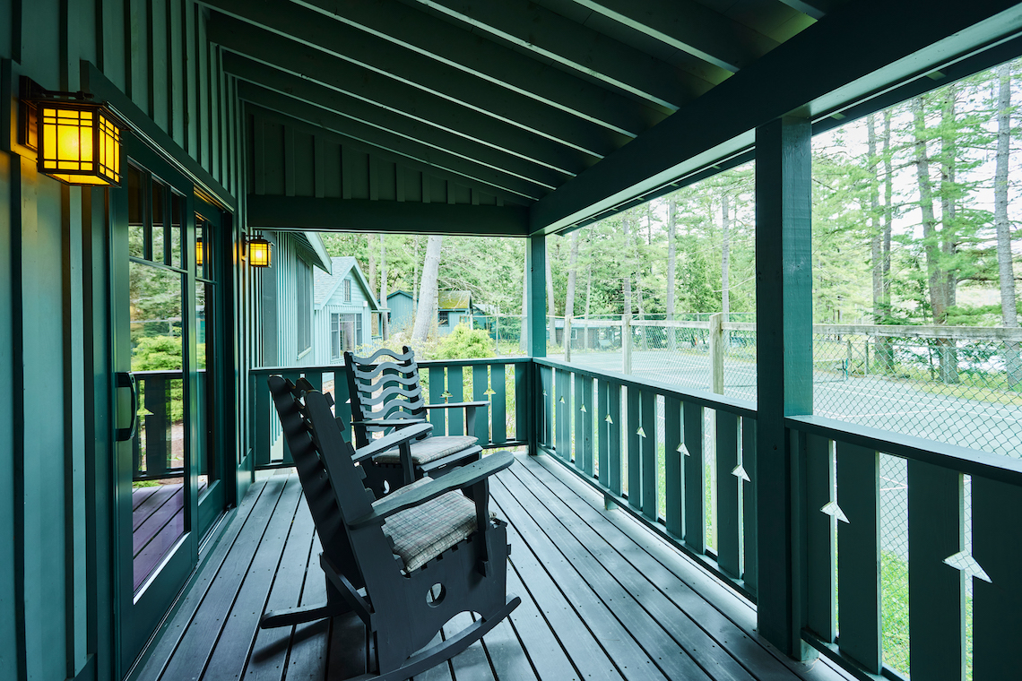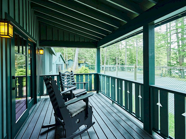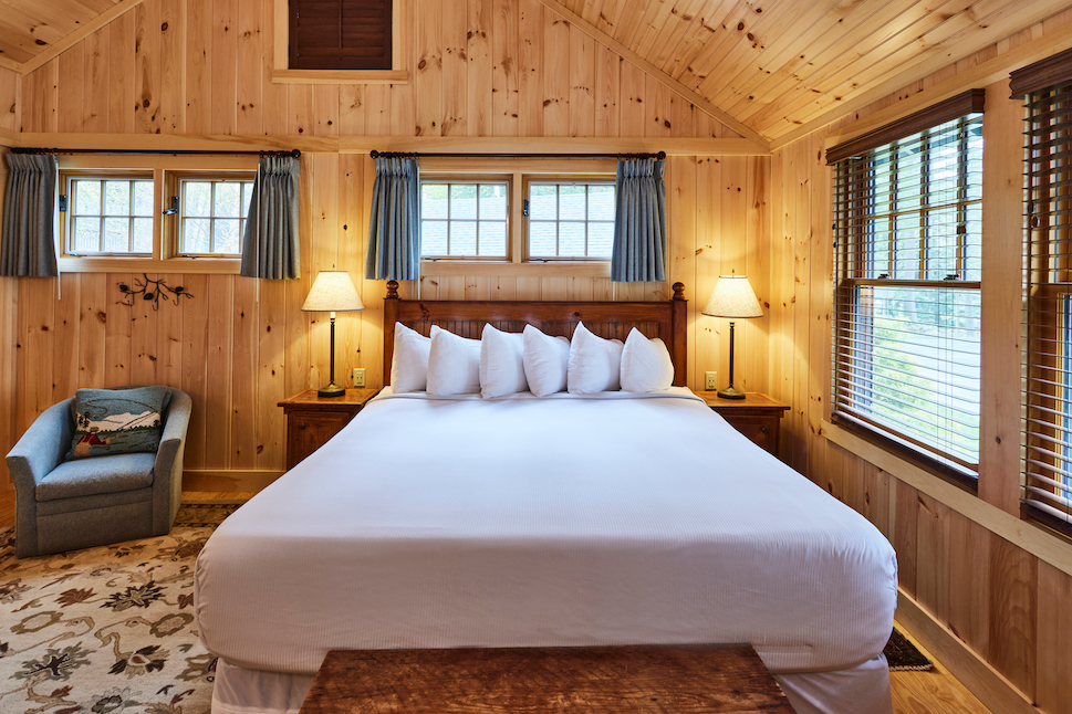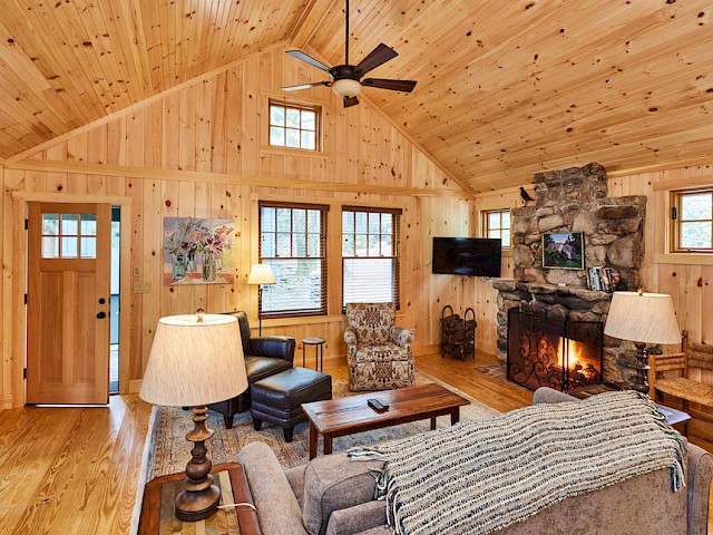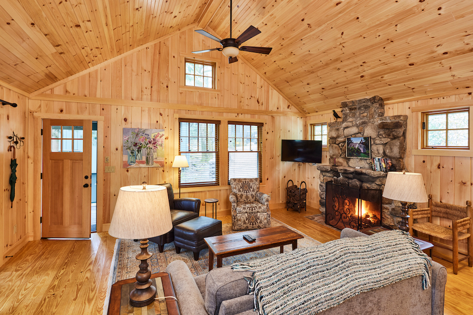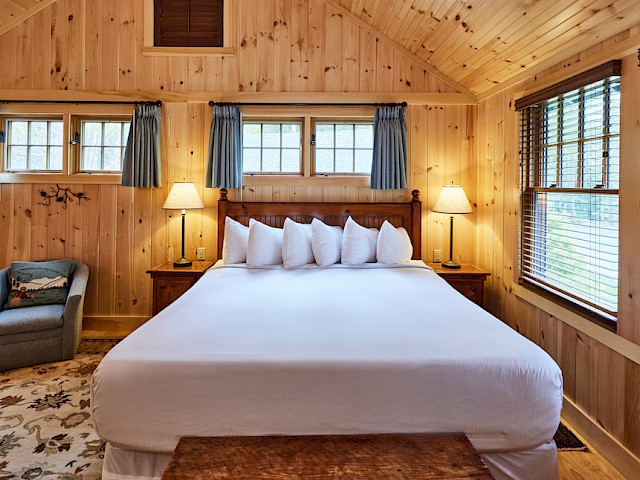 Raven has a roomy covered porch with rockers and lake view over the very end of our single tennis court and is conveniently located near our Main Lodge. The living room has a cathedral ceiling, fieldstone fireplace, flat screen TV, and wet bar area with refrigerator. The separate bedroom has a king bed and the full bath has a separate tub and shower. There is a queen-sized pullout couch in the living room and room for cot or pack ‘n play.