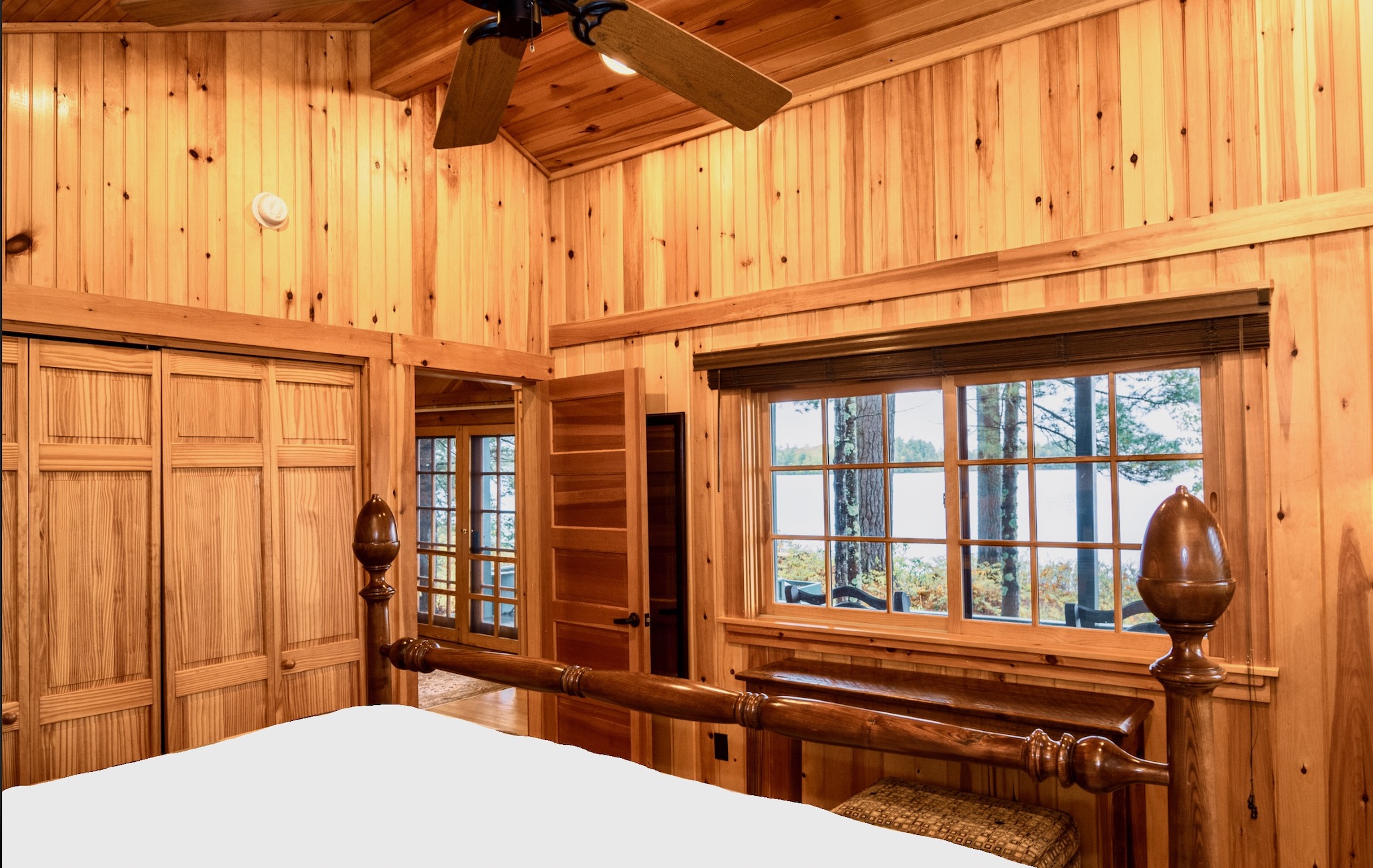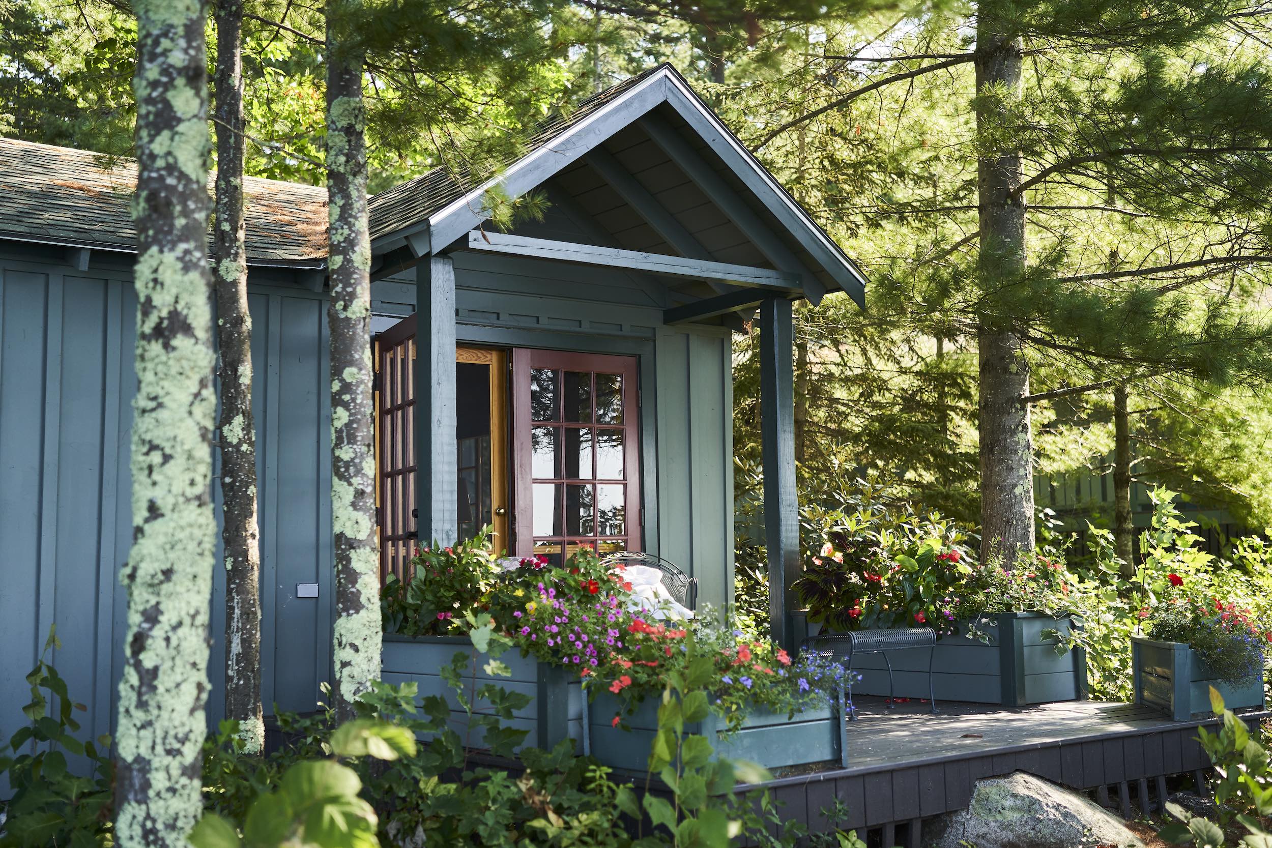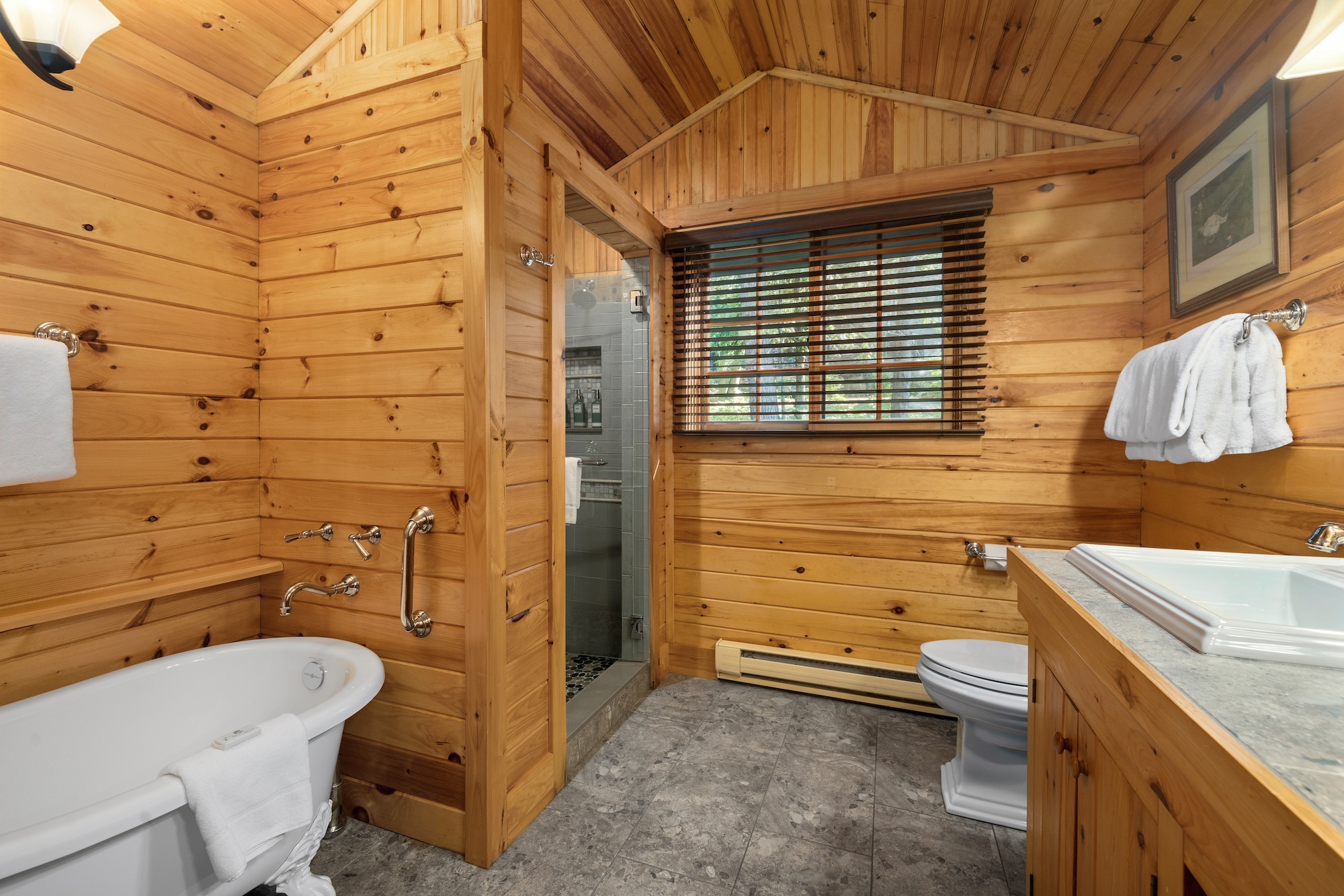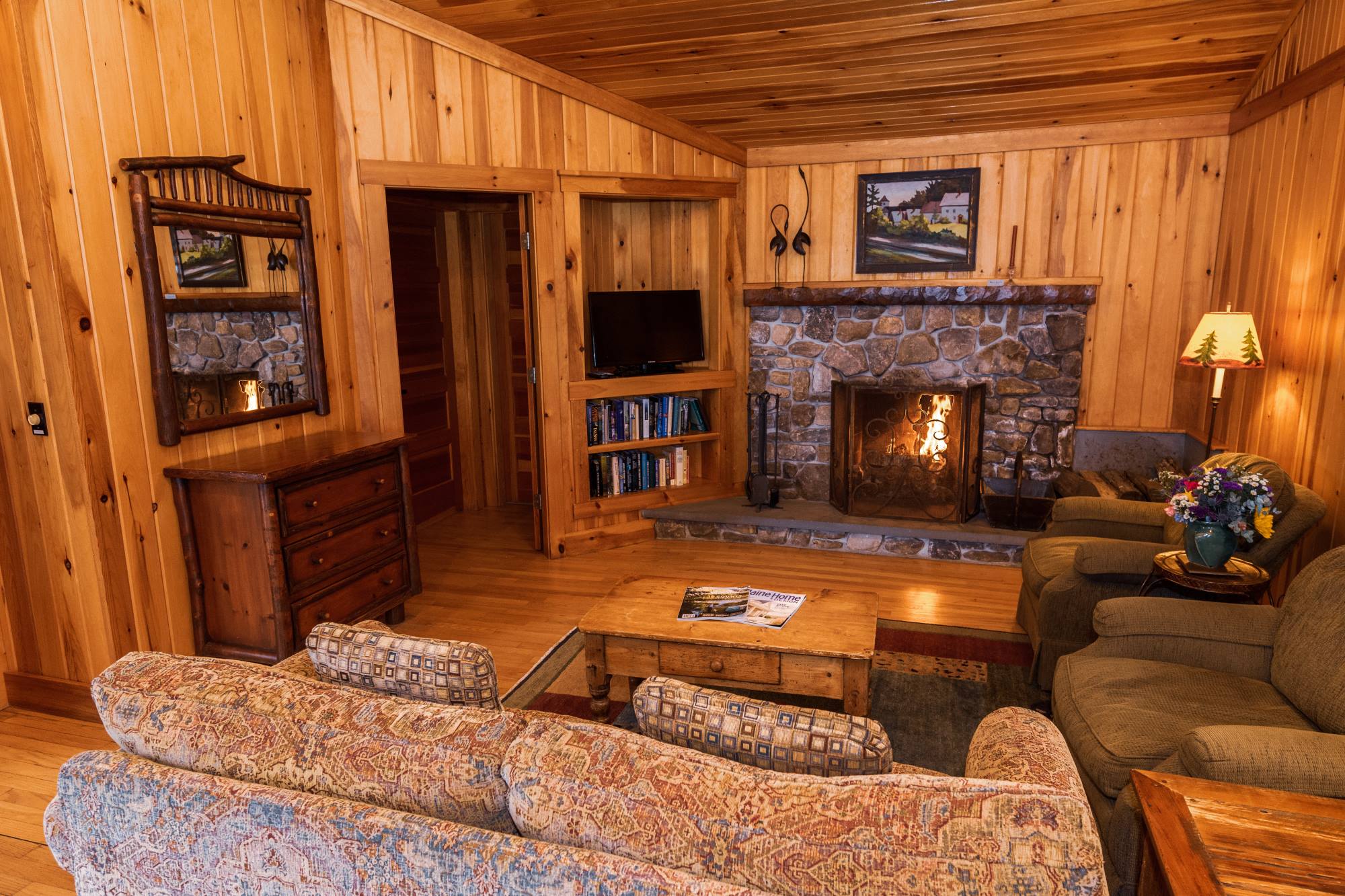 One of our premier one bedroom accommodations, Sunset is located lakeside. The living room has a fieldstone fireplace on one end and French doors facing the lake on the other which lead to a furnished open deck, perfect for relaxing with a good book, enjoying a glass of wine, or watching the sun set over Sebago. The living room has cathedral ceiling, flat screen TV, and wet bar with undercounter refrigerator. The bedroom has a king bed with a lake view. The full bath has double vanity, soaking tub, and separate shower. There is a queen size pull out couch in the living room and room for cot/pack ‘n play.