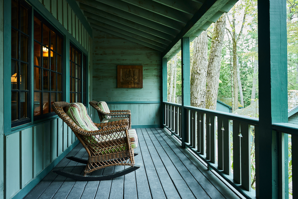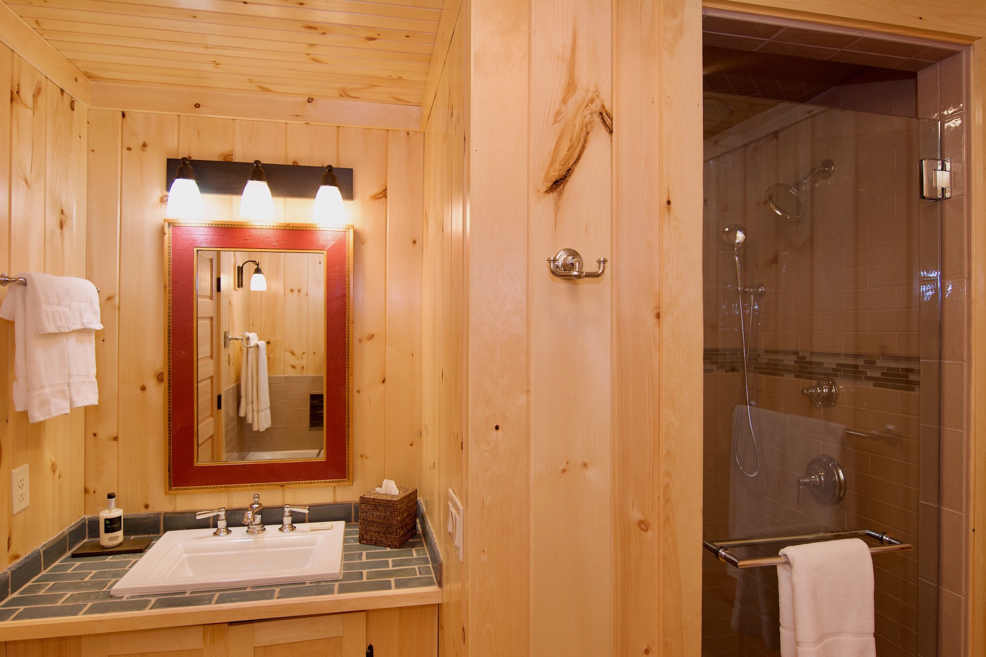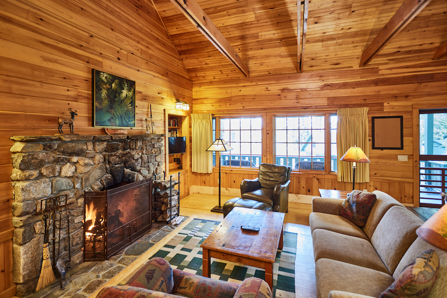 Tamarack, located near our Main Lodge, is one of our largest one bedroom cottages. The furnished front porch has lake views and the living room has cathedral ceiling, fieldstone fireplace, flat screen TV, and wet bar with undercounter refrigerator. Up a few steps is a large walk-in closet, a full bath with soaking tub, separate shower, and a convenient additional vanity just outside. Just behind is the spacious bedroom with two queen beds. There is a queen-size pullout couch in the living room and room for cot/pack ‘n play. There are 11 steps to the front porch.