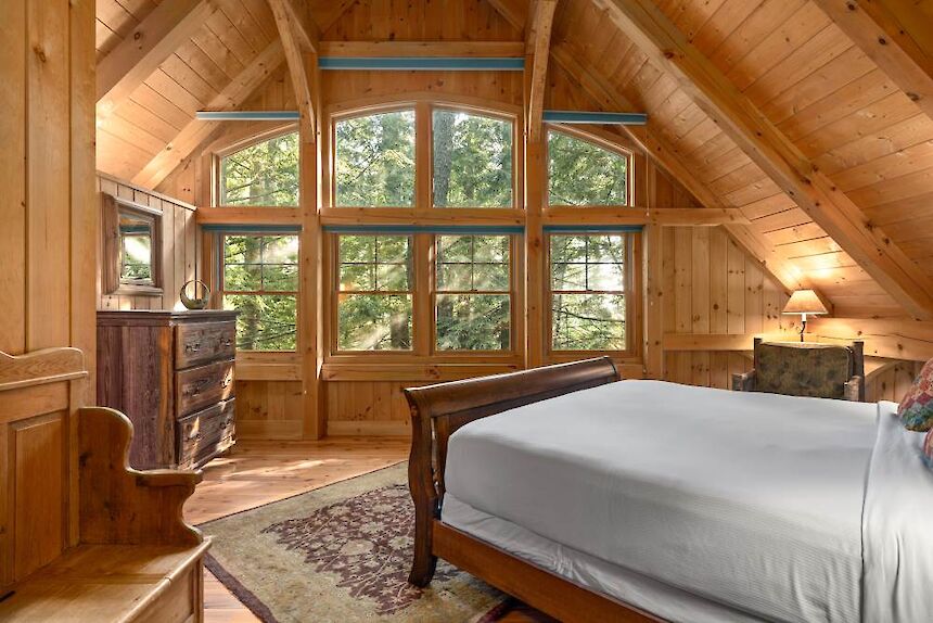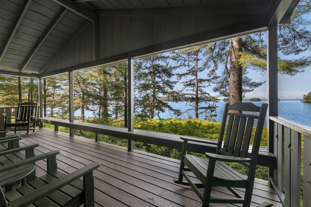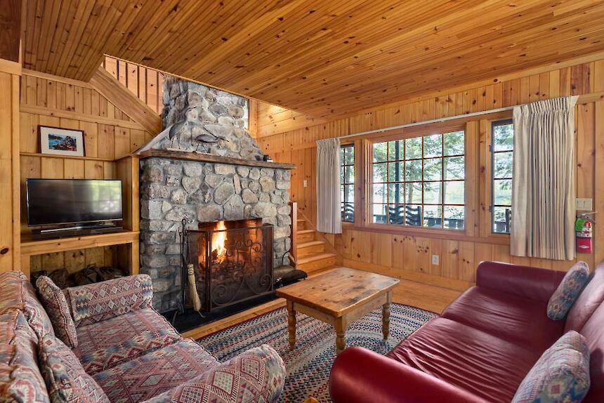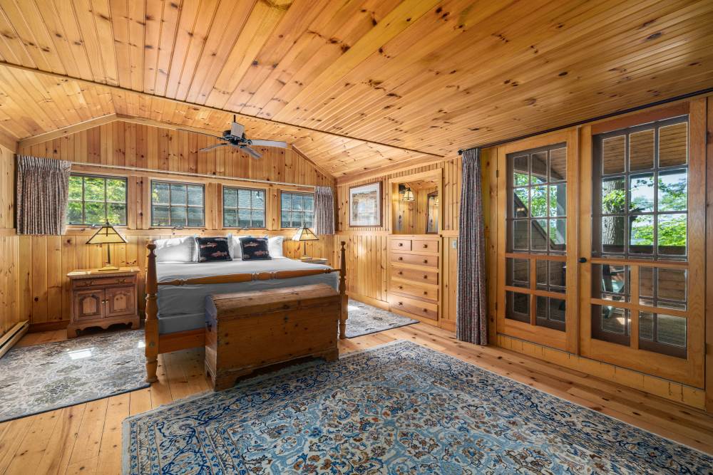 Adjacent to the Main Lodge, this level entry accessible cottage has a covered front porch and sunken open front deck. Fieldstone fireplace, flat screen smart TV, and wet bar with under-counter refrigerator in the living room. The upstairs primary bedroom has a private balcony with lake views.