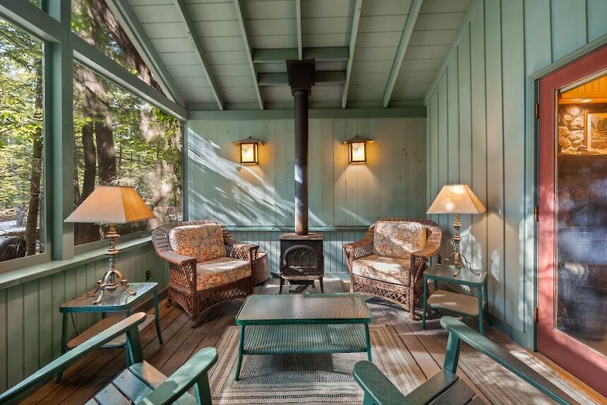 Three bedroom three bath cottage, featuring a spacious furnished screened-in porch with woodstove. Roomy living room with cathedral ceiling, fieldstone fireplace, and flat-screen tv.