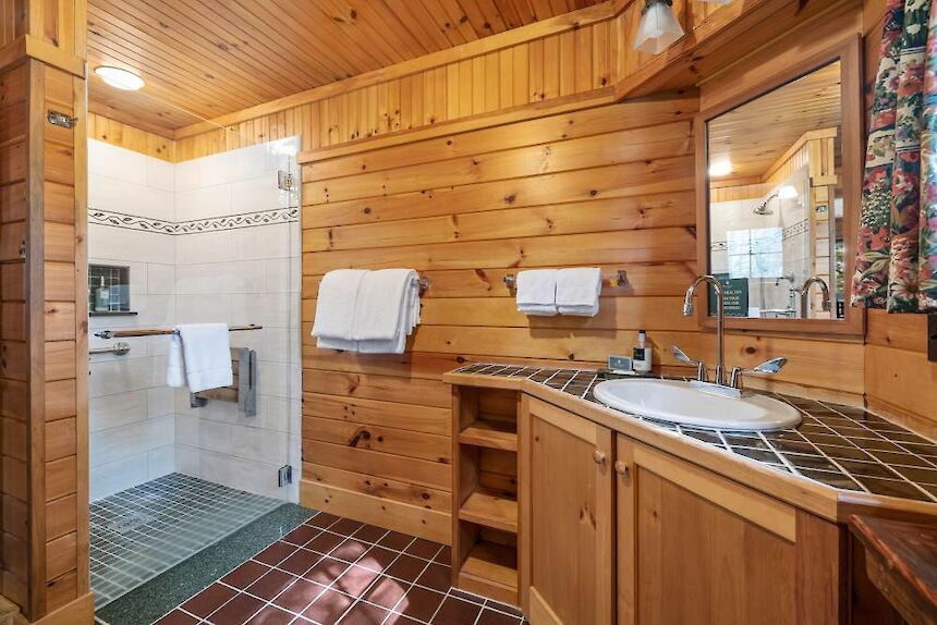 One of our most spacious two-bedroom accommodations, Ledges is located in a wooded setting just over a small footbridge. The log-sided cottage has a fully furnished covered front porch with outside fireplace. The lofty two-story open living room has a staircase winding around the cottage’s second fieldstone fireplace.
