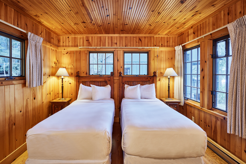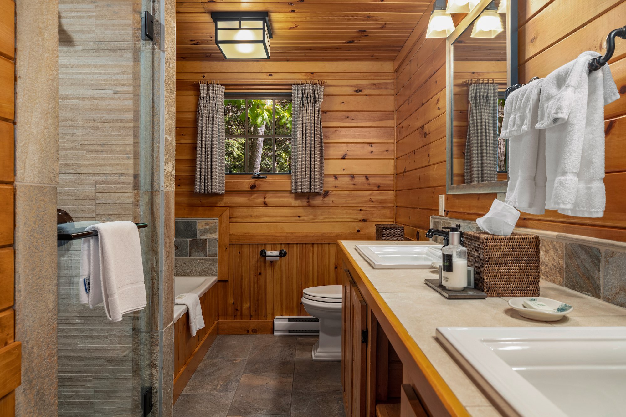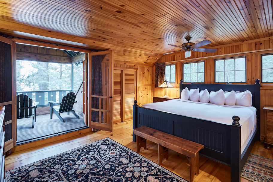 Firefly has a covered front porch with rockers and lake views. The living room has a fieldstone fireplace, wet bar with undercounter refrigerator, and flat screen TV. The first floor bedroom can be set up as a king bed or twin beds. The adjacent full bathroom has a tub/shower combination. Two additional bedrooms are located on the second floor. The primary bedroom has a king bed, private furnished covered balcony, and an en-suite bathroom with combination tub/shower and dual sinks. The smaller second upstairs bedroom can be set up as twin beds or a king bed. The primary bedroom has room for a cot or pack ‘n play. There are 10 steps to the front porch.