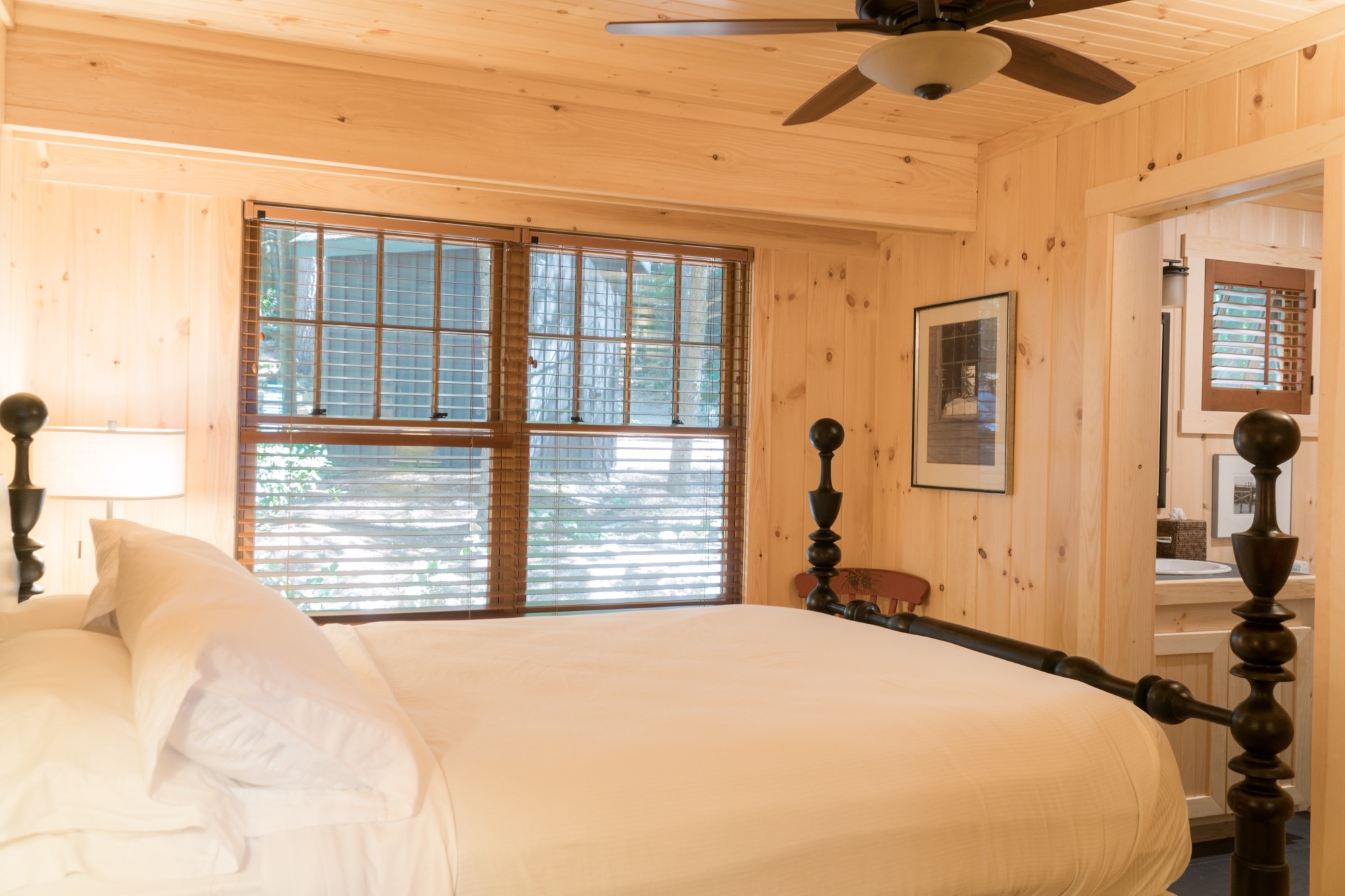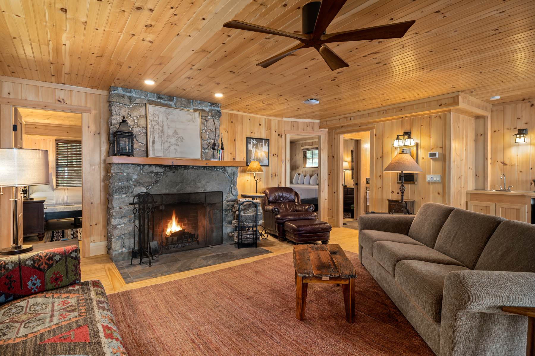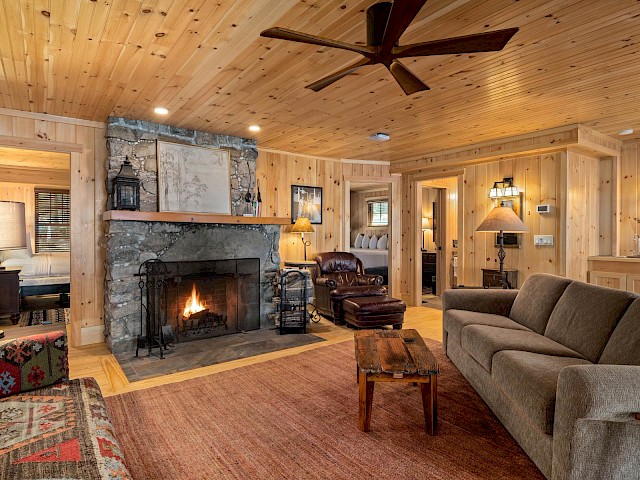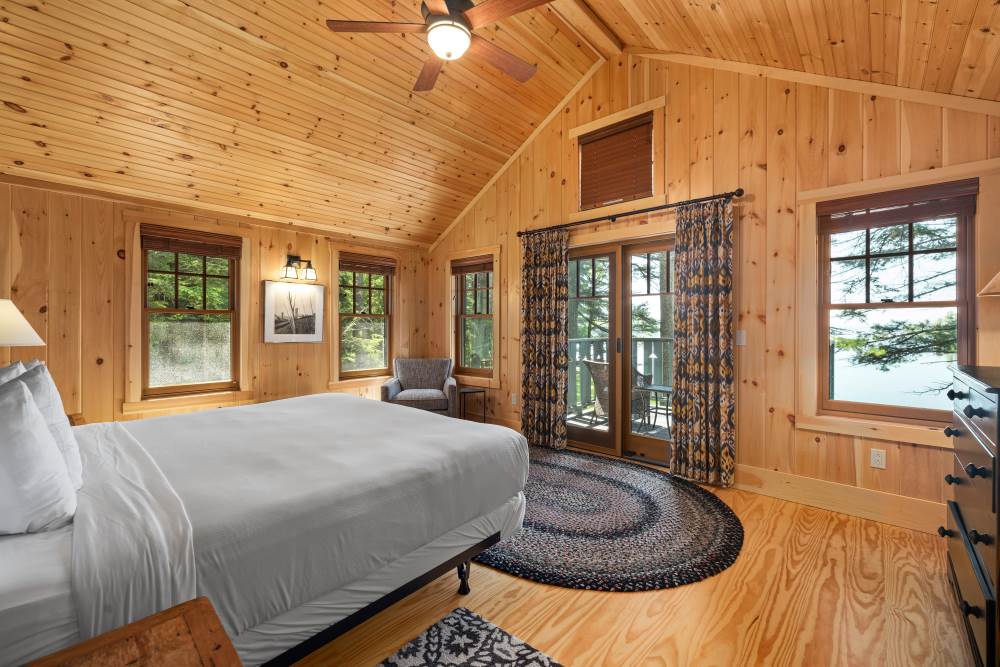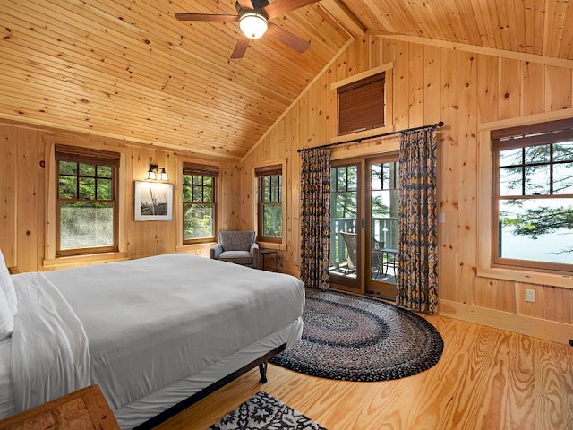 Gray Gull 1 is a three bedroom/three bath lakeside duplex cottage. There are wonderful views of the lake from rockers on the front porch. The living room has a fieldstone fireplace, flat screen TV, and wet bar with undercounter refrigerator. There are two first floor bedrooms. The first has a queen bed with en-suite bathroom with shower, and the second can be set up as a king bed or twin beds, also with en-suite bath with a tub/shower combination. The second floor primary bedroom is a spacious room with king bed, private balcony overlooking the lake and large en-suite bathroom with stall shower and separate soaking tub. There is a pullout couch in the living room and space for a cot or pack n’ play. There are 8 stone steps up to the front porch.