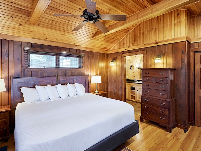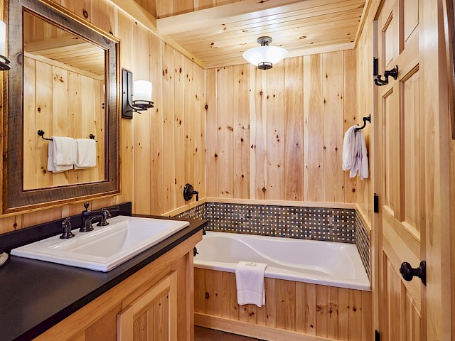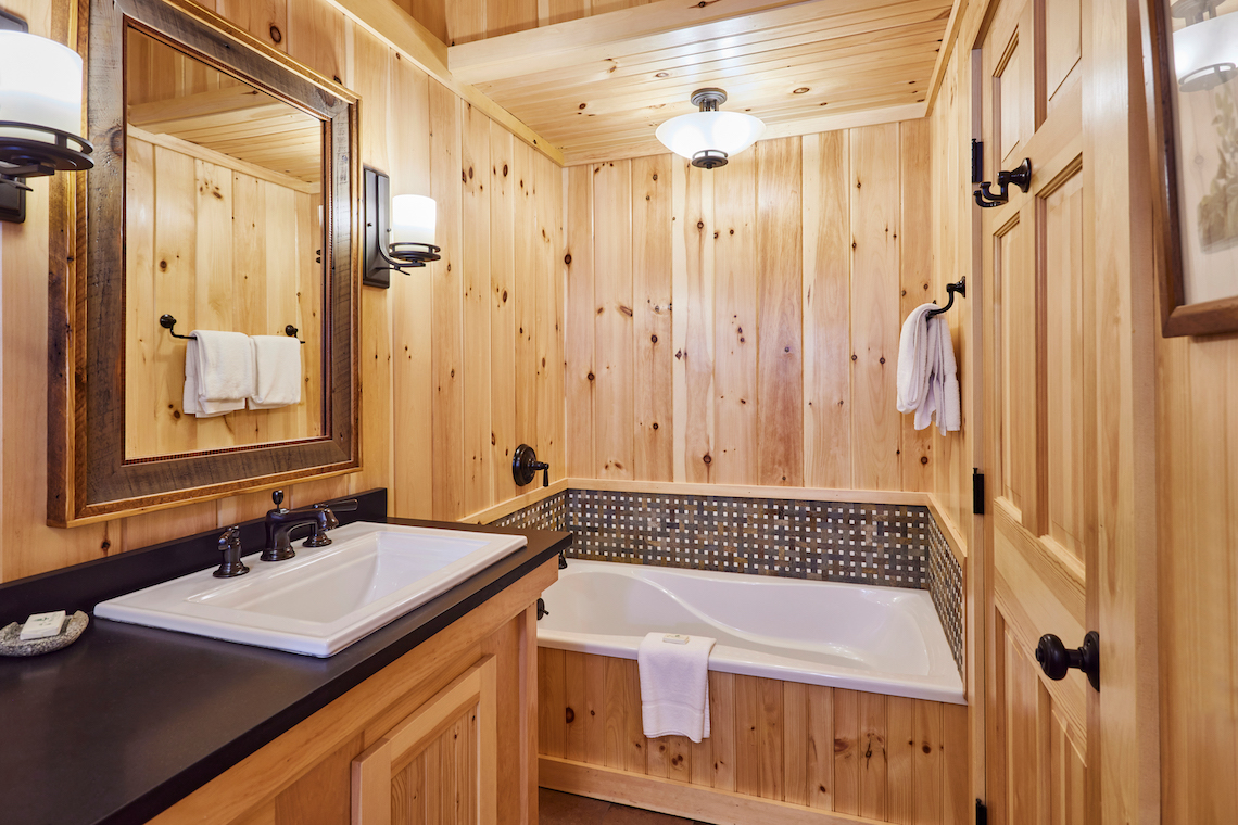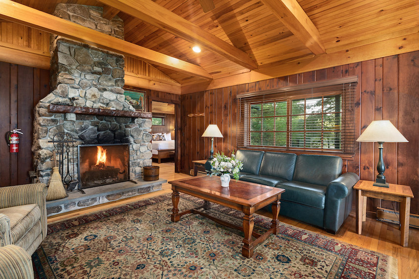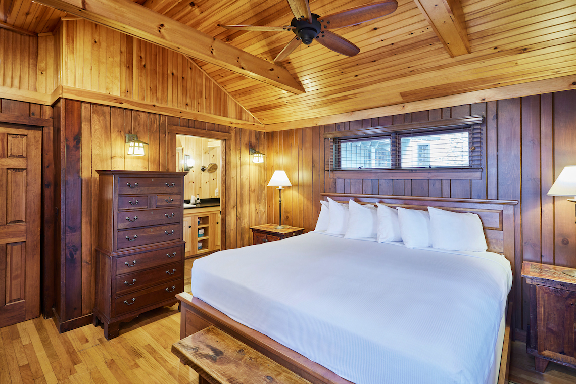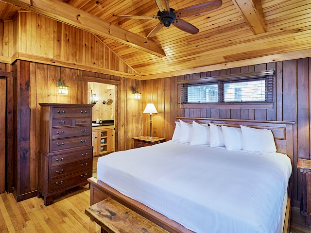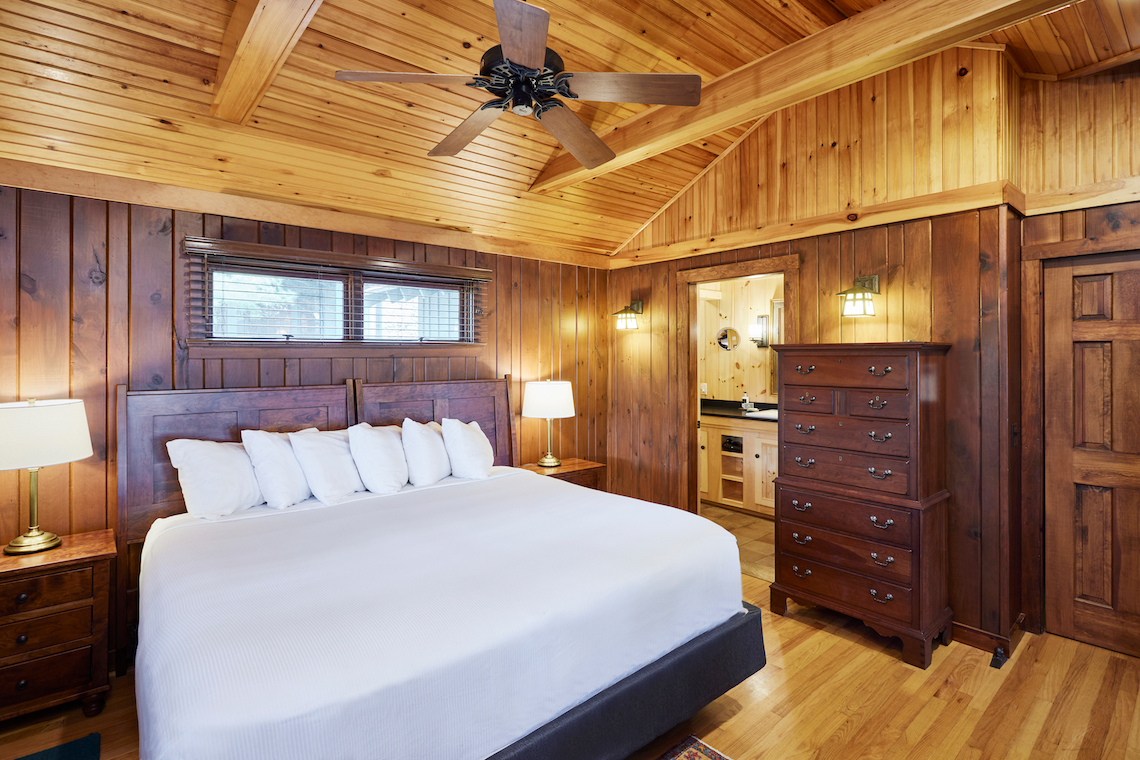 One of our premier two bedroom accommodations, Spruce is located just steps from the lake. The wraparound covered porch provides unparalleled views of Sebago. On one end of the living room is a fieldstone fireplace and on the other a large sliding glass door opens towards the lake onto the porch. The living room has a cathedral ceiling, flat screen TV, and wet bar with undercounter refrigerator. The master bedroom has a king bed and en-suite bathroom with dual vanity, soaking tub and separate shower. The second bedroom can be a king bed or twins and has an identical en-suite bathroom with dual vanity, soaking tub and separate shower. Each bedroom has a private entrance onto the wraparound porch. There is a queensize pullout couch in the living room and room for cot/pack ‘n play. There are 7 steps up to the porch.