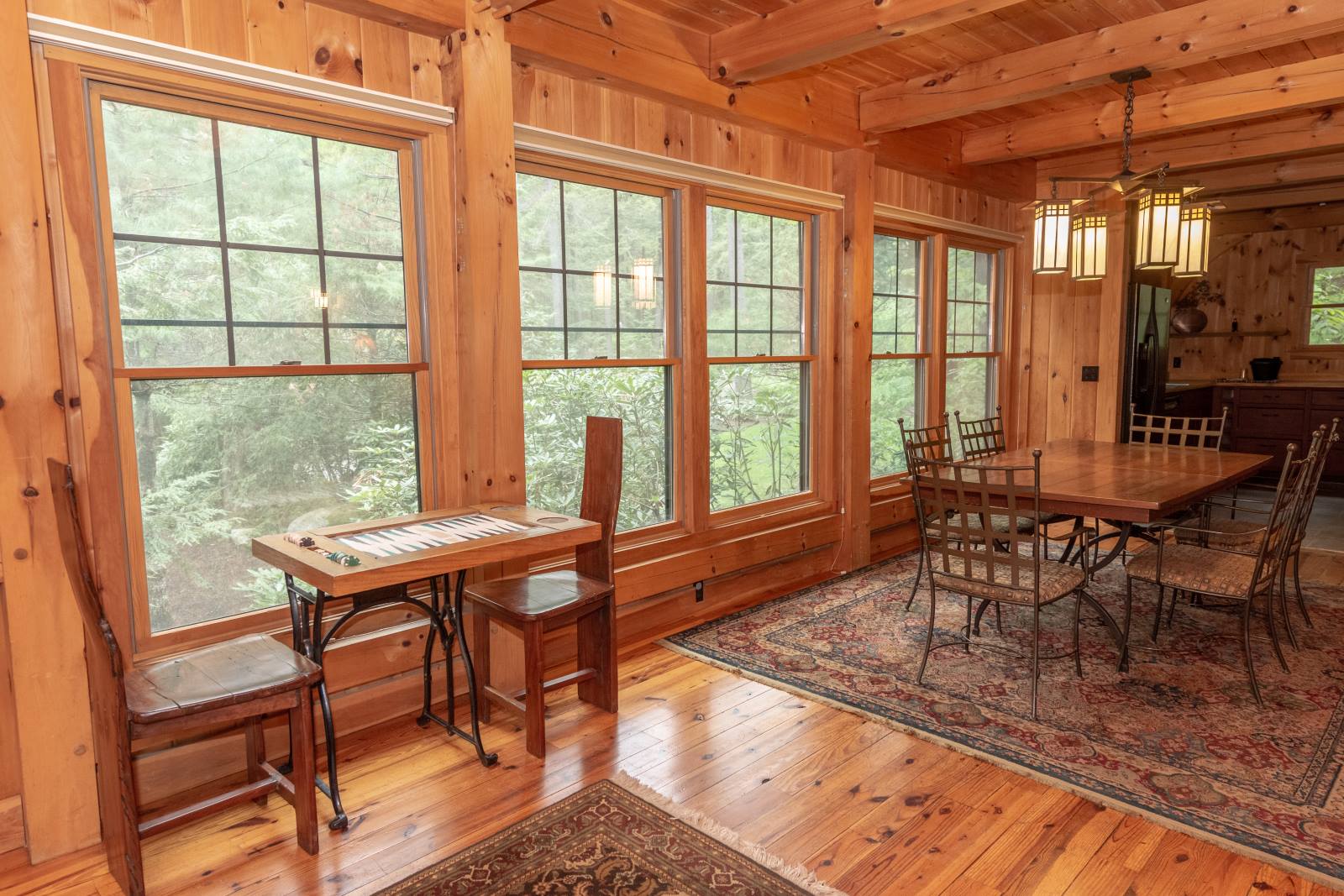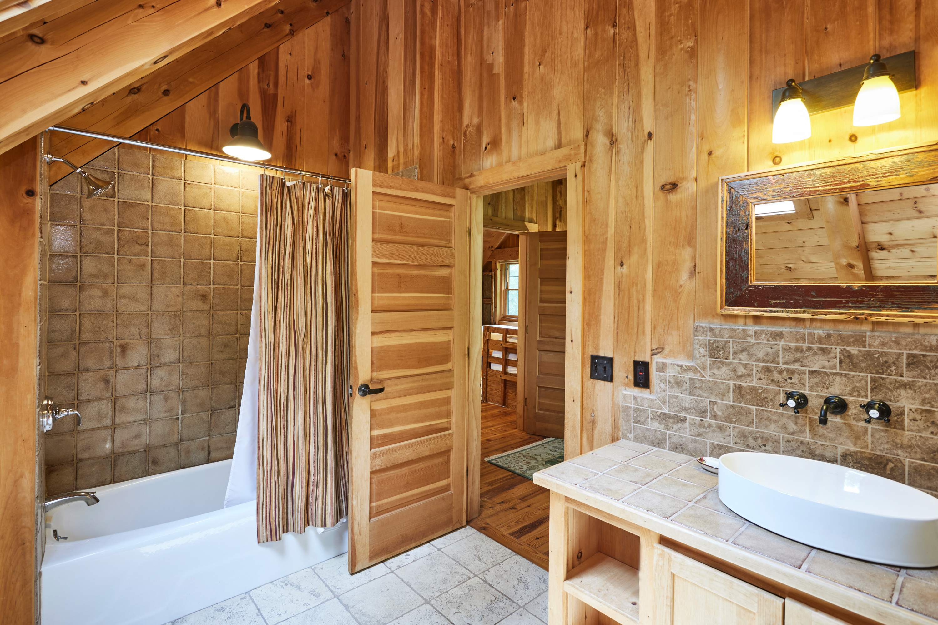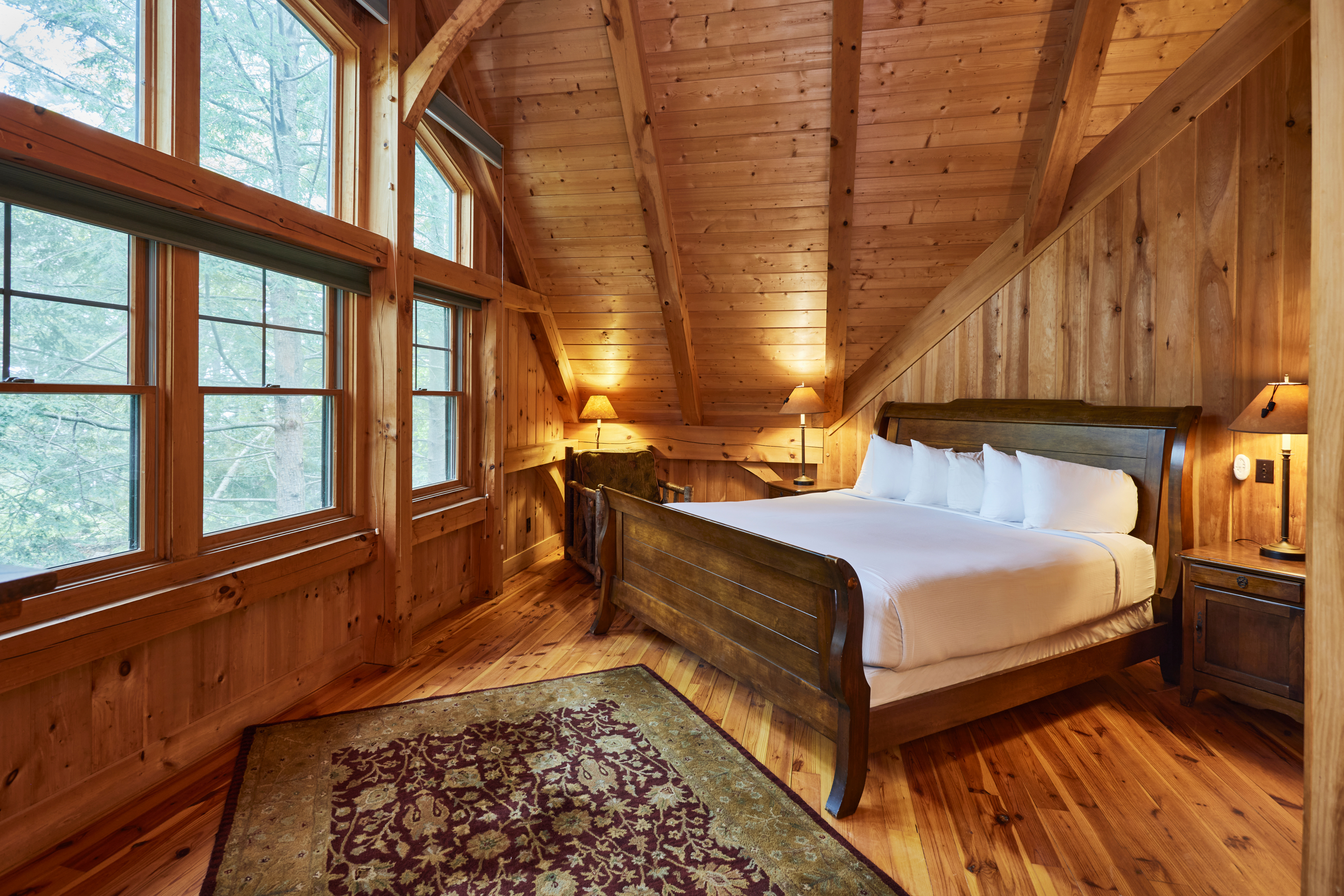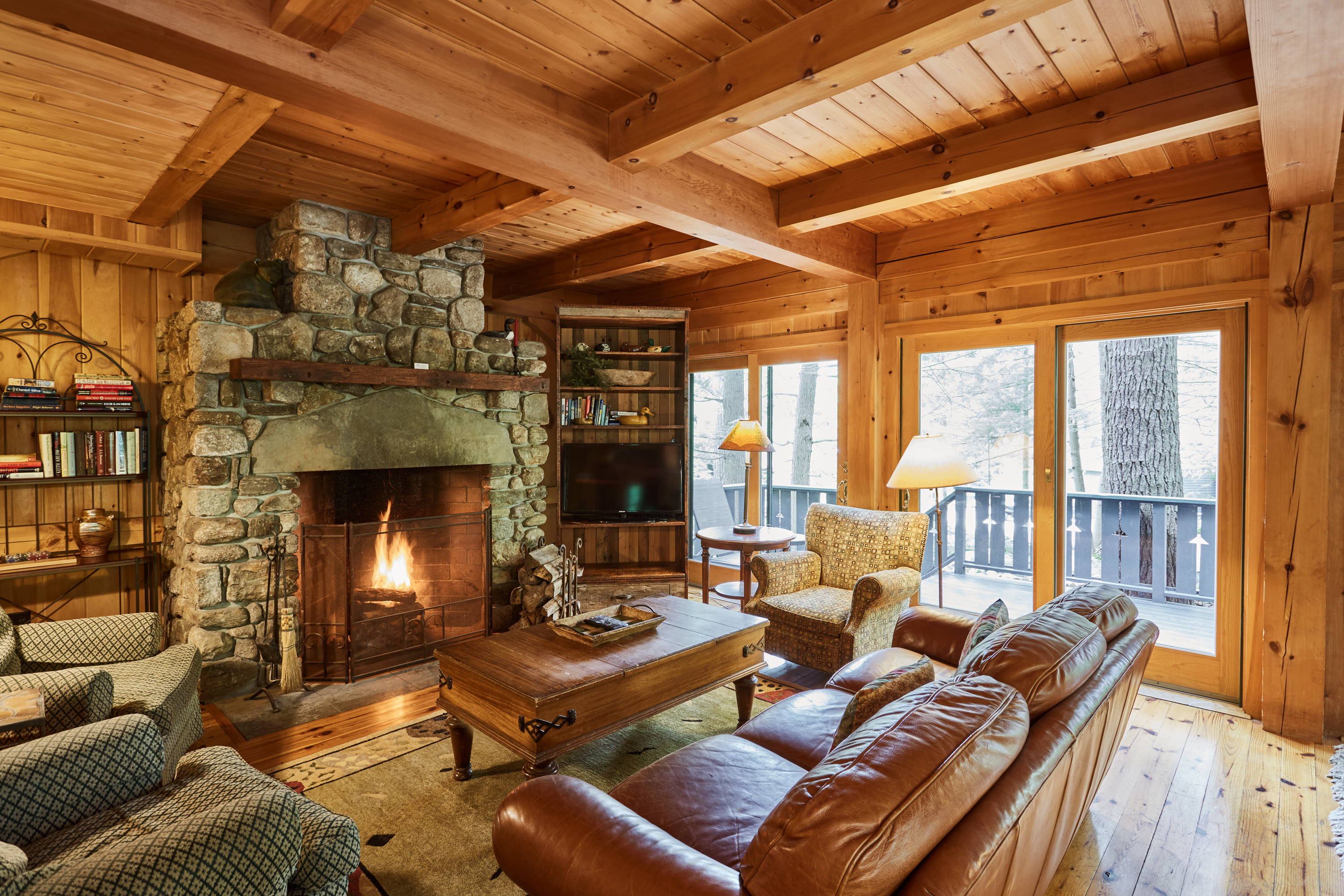 Timbers is a centrally located post and beam cottage with two bedrooms (one with king bed, one with queen) and two full baths (one with shower/tub, one with steam shower) upstairs and a loft space with twin beds. There is also a small first floor single bed alcove with a half bath adjacent to the nearby living room. There is a large furnished open deck, living room with massive fieldstone fireplace, a dining table (great for family games, crafts and puzzles) and a full kitchen. All meals are included in your rate, so the full size refrigerator is convenient for drinks and snacks.