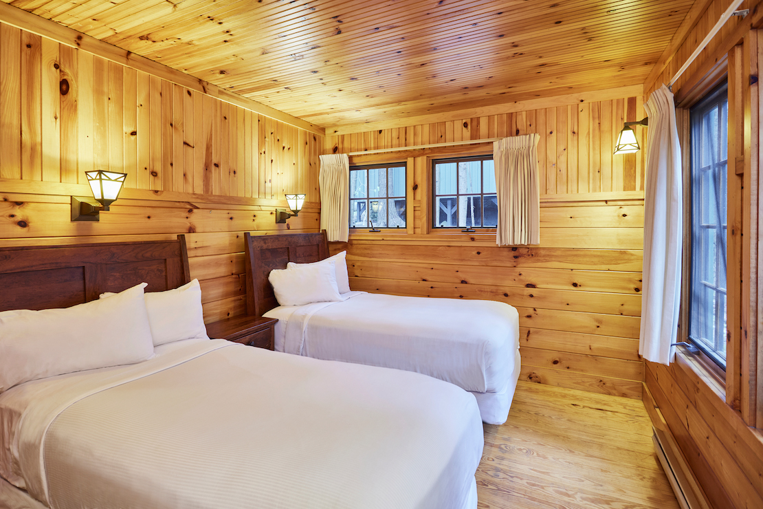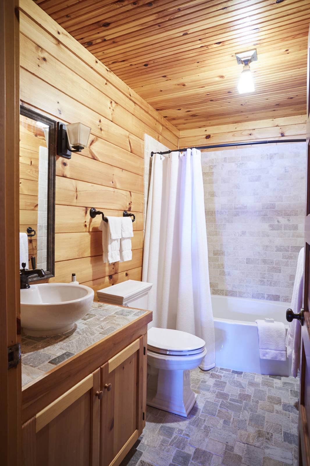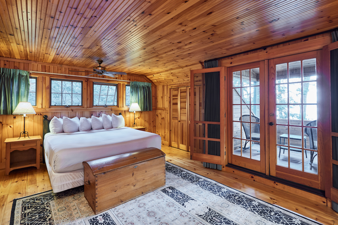 White Pine has a covered front porch with rockers and lake views. The living room has a fieldstone fireplace, wet bar with undercounter refrigerator, and a flat screen TV. There are two first floor bedrooms. The first has a queen bed and the second can be made up as a king or twins. These bedrooms share a full bath in the hallway which has a tub/shower combination. The primary bedroom on the second floor has a king bed, furnished covered balcony overlooking the lake, and an en-suite full bath with combination tub/shower. There is a pullout couch in the living room and room for a cot or pack ‘n play. There are 12 steps to the front porch.