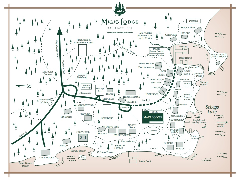 Take the Maine Turnpike (I-95) to Exit 48; take a right onto Riverside Street at the end of the ramp. Go straight through two sets of stop lights. At the third set of lights, turn left onto Route 302 (West). Follow Route 302 for around 19 miles through the towns of Westbrook, Windham, Raymond and into Casco, until you see our sign on the left (brown and gold and set back from the road) onto Migis Lodge Road. Follow Migis Lodge Road to the small parking area marked "Parking for Check-in Only". Please drive gently! Our Main Lodge is to your left - follow the signs to our Office which is on the far side of the Main Lodge.