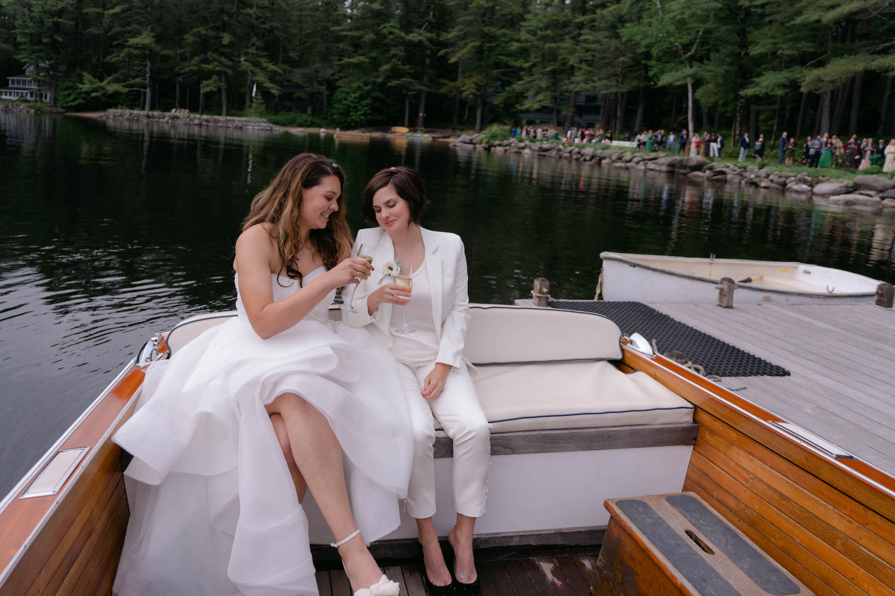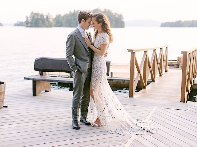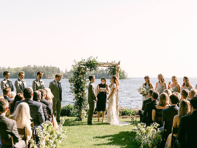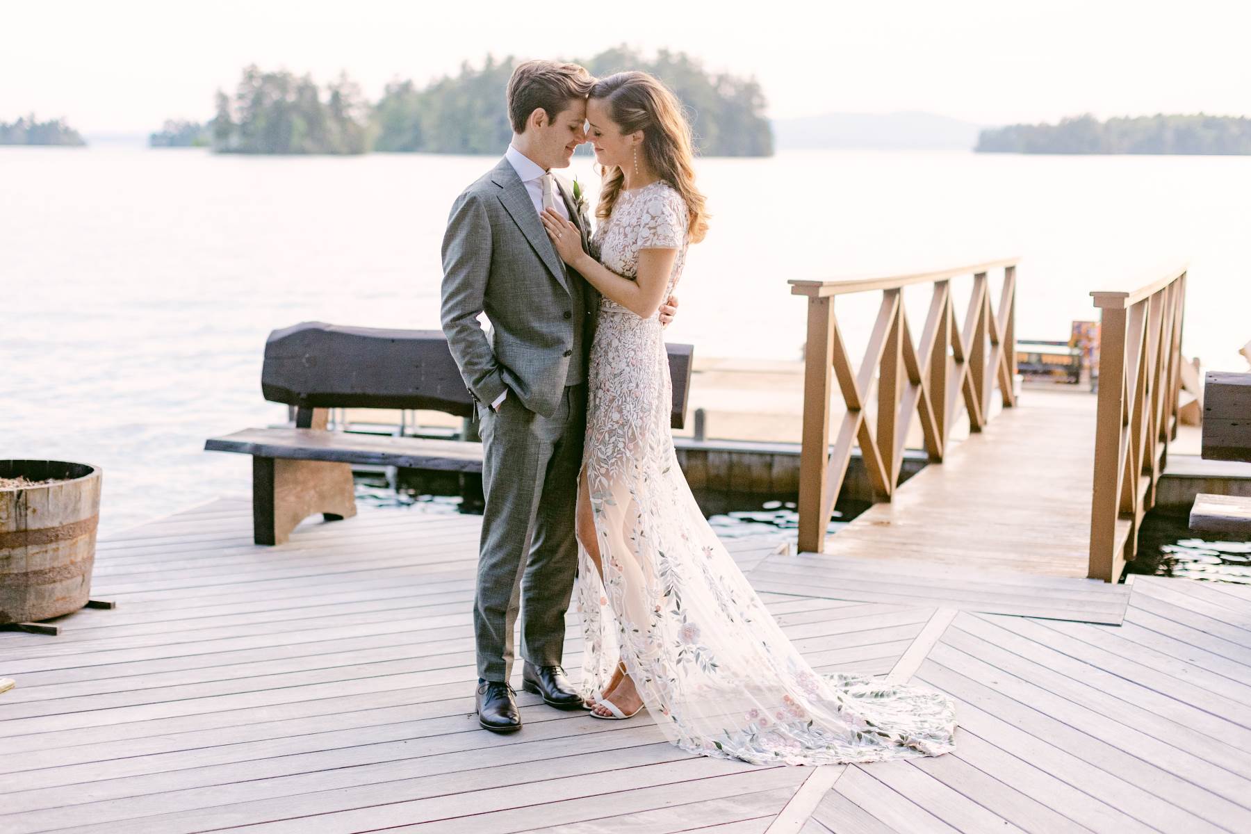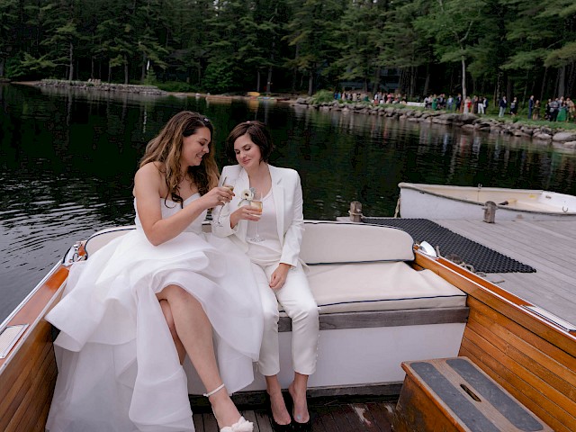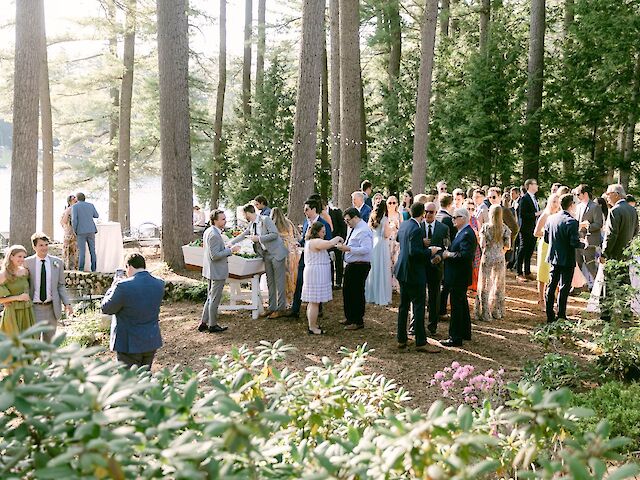 Migis Lodge is a magical location for a wedding and reception... imagine the wedding party arriving at their ceremony on our classic 1947 Chris Craft, and exchanging vows under the pines with Sebago Lake and Maine's Western Mountains serving as a stunning backdrop. After the ceremony, the couple and guests will enjoy cocktails, dinner and dancing in our lakeside lodge, and perhaps finish the evening around a bonfire on our front terrace.